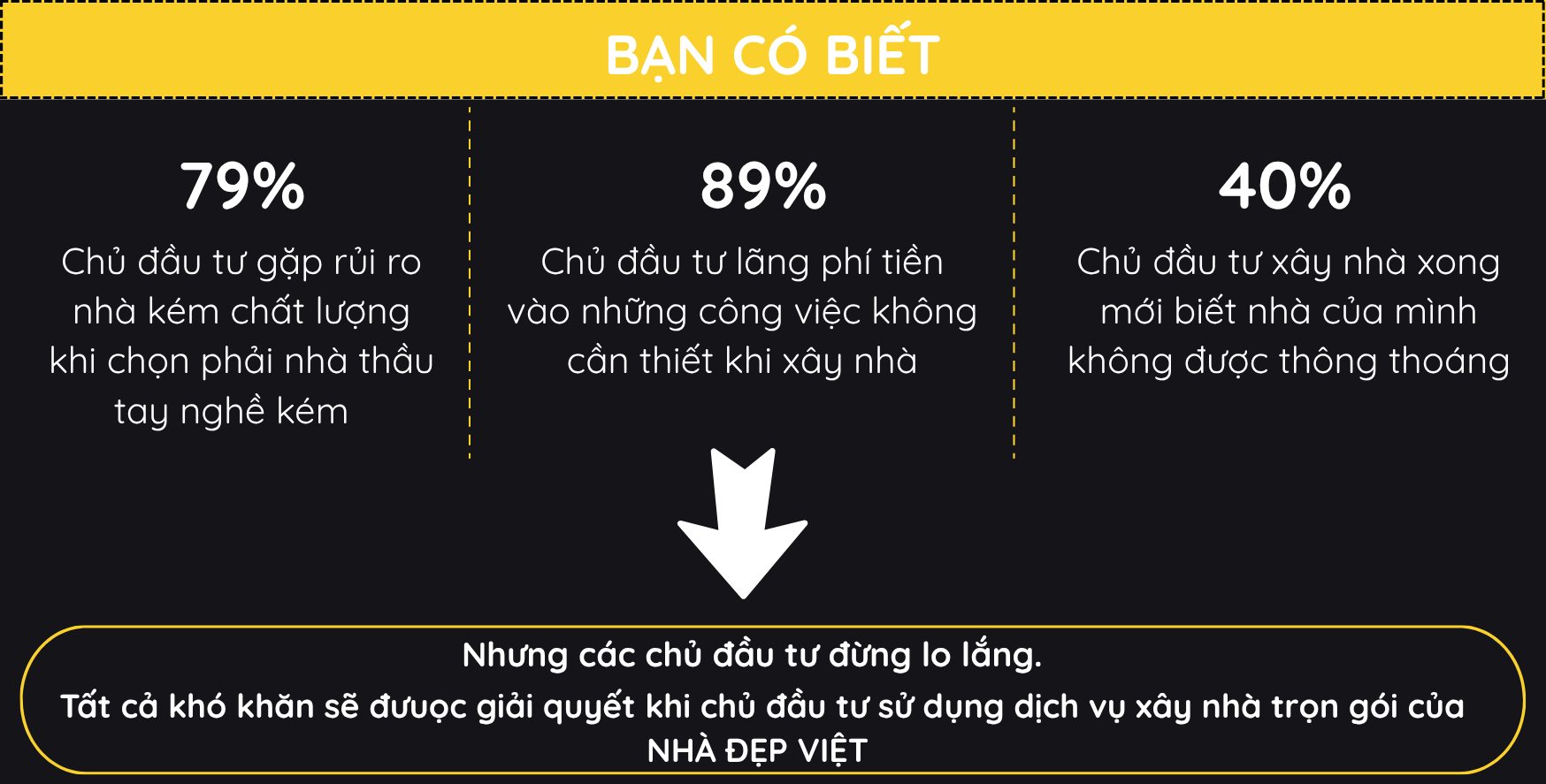 Nếu quý vị đang có nhu cầu thiết kế và thi công xây nhà trọn gói, hãy để Nhà Đẹp Việt đồng hành cùng quý vị. Chúng tôi sẵn lòng truyền đạt kinh nghiệm quý báu trong việc lựa chọn nhà thầu xây nhà trọn gói uy tín. Hãy để chúng tôi mang đến những sản phẩm chất lượng với giá thành tốt nhất và chinh phục những mong đợi của quý vị.