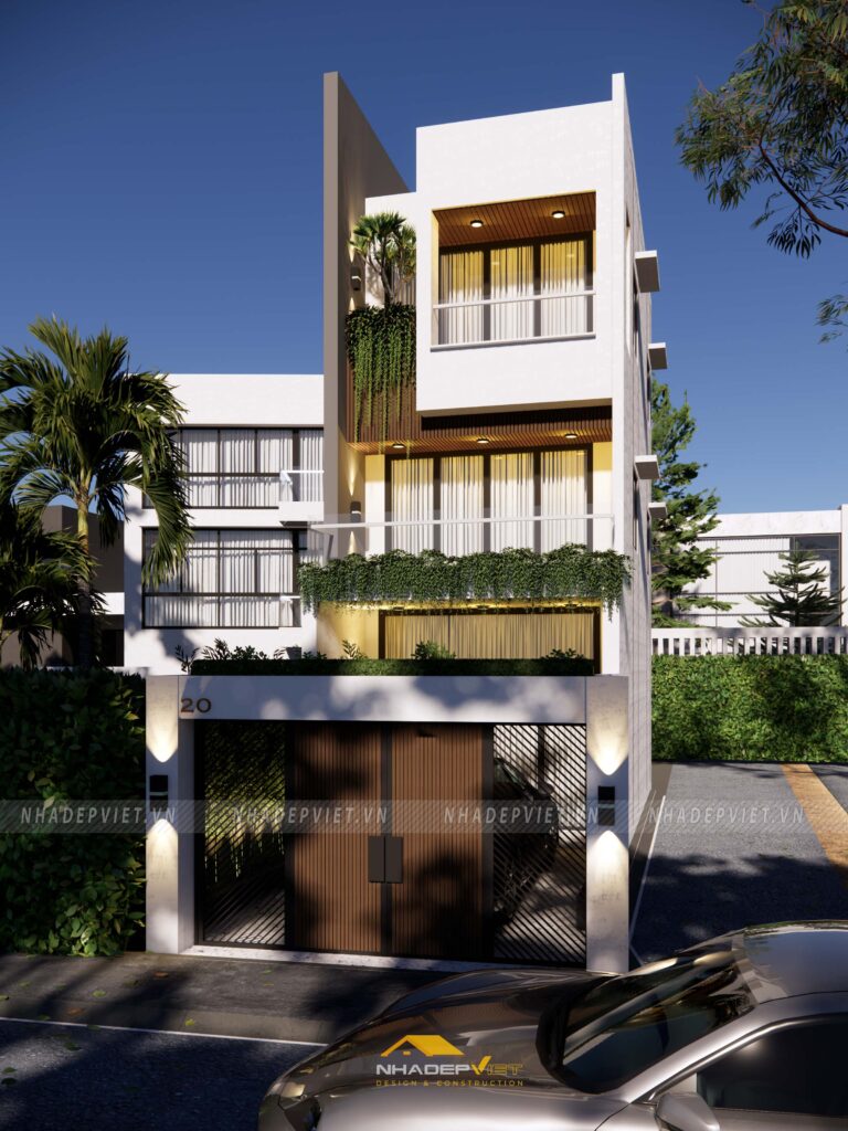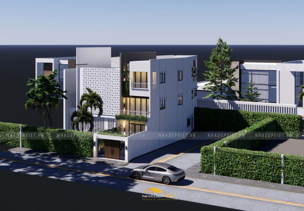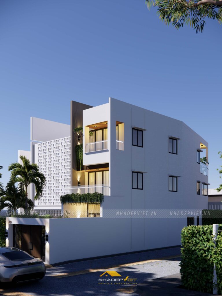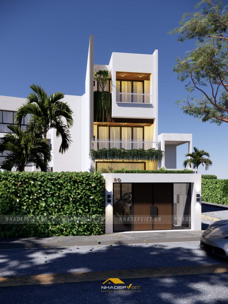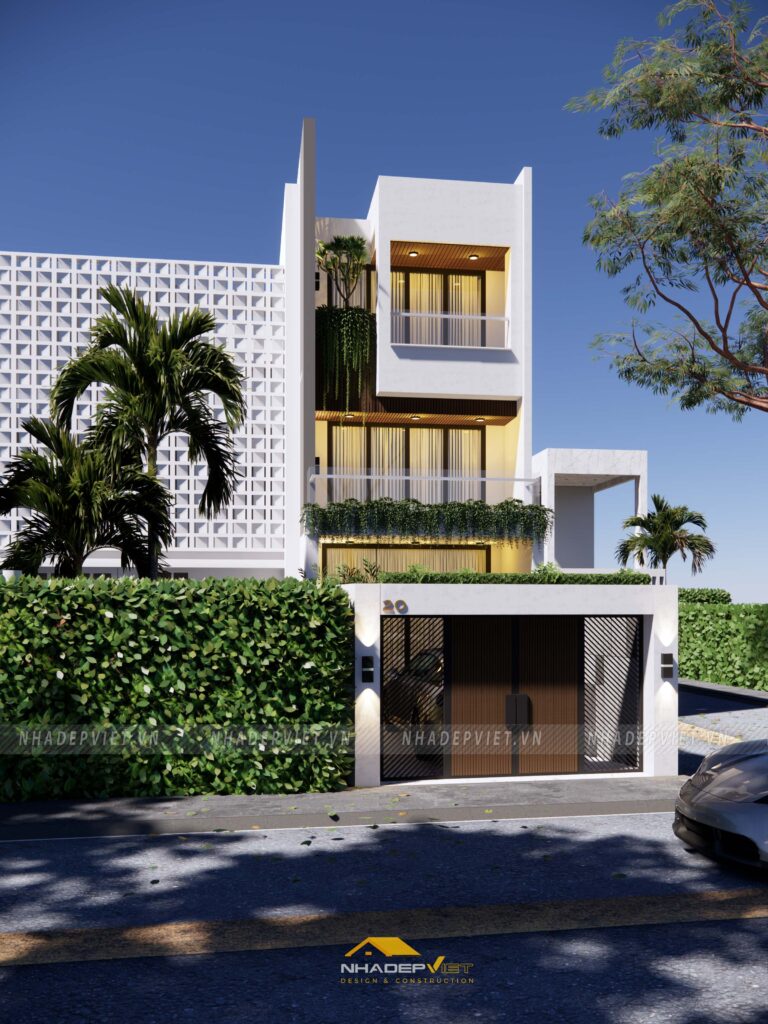 Mẫu thiết kế biệt thự hiện đại với điểm nhấn là sự kết hợp hài hòa giữa hình khối tối giản, vật liệu tự nhiên và không gian mở đón sáng. Ngôi nhà chú trọng tính riêng tư nhưng vẫn tạo cảm giác gần gũi nhờ các chi tiết lam gỗ, ban công xanh và nội thất nhẹ nhàng. Thiết kế phù hợp cho gia đình trẻ sống trong đô thị, yêu thích sự tiện nghi, gọn gàng nhưng vẫn có chiều sâu cảm xúc.