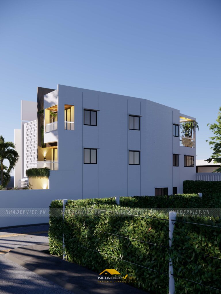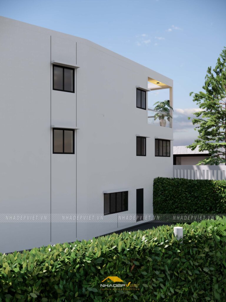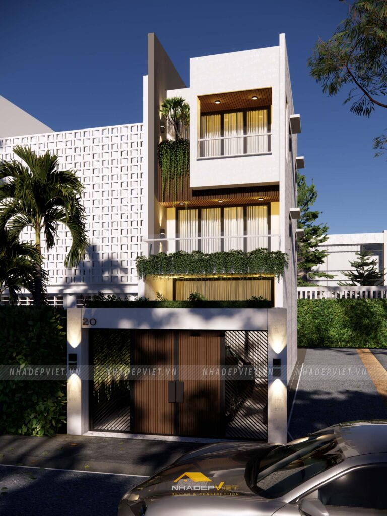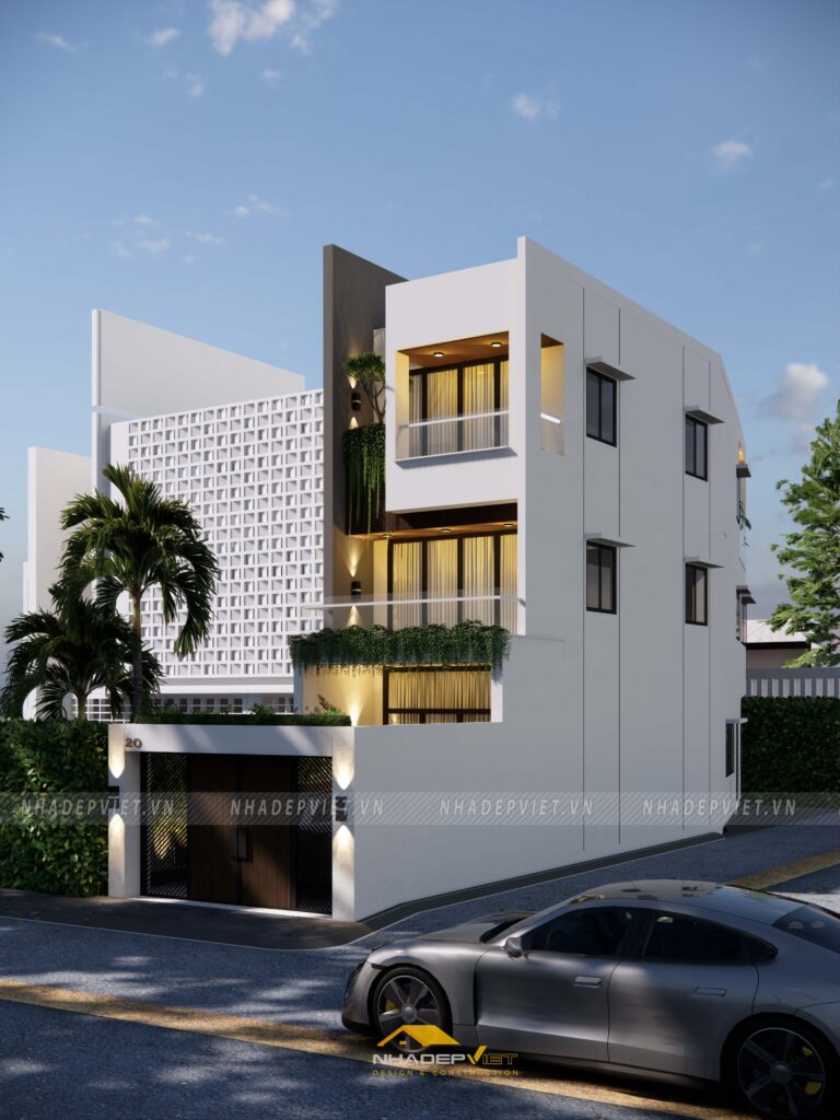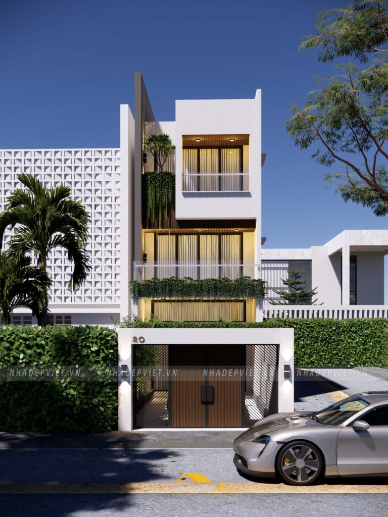 Mẫu thiết kế biệt thự hiện đại với điểm nhấn là sự kết hợp hài hòa giữa hình khối tối giản, vật liệu tự nhiên và không gian mở đón sáng. Ngôi nhà chú trọng tính riêng tư nhưng vẫn tạo cảm giác gần gũi nhờ các chi tiết lam gỗ, ban công xanh và nội thất nhẹ nhàng. Thiết kế phù hợp cho gia đình trẻ sống trong đô thị, yêu thích sự tiện nghi, gọn gàng nhưng vẫn có chiều sâu cảm xúc.