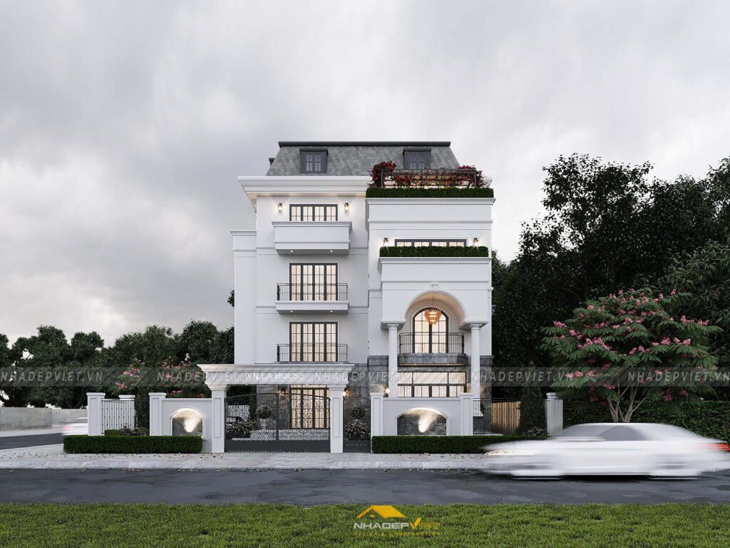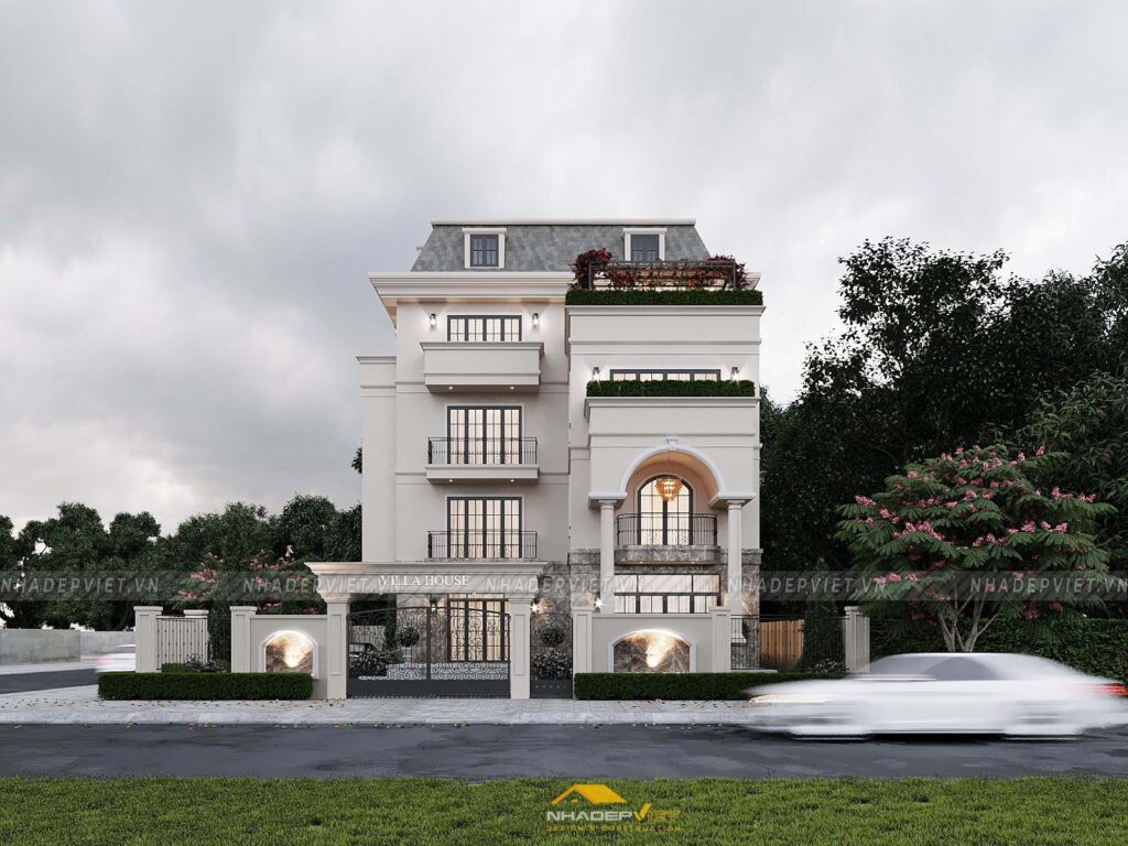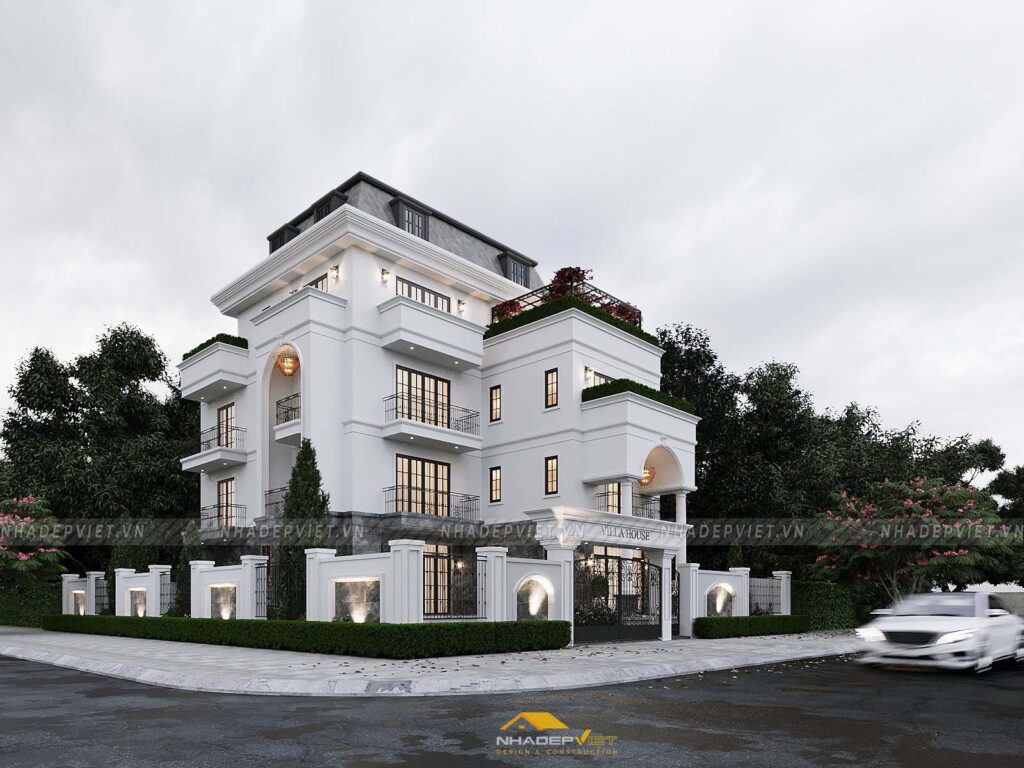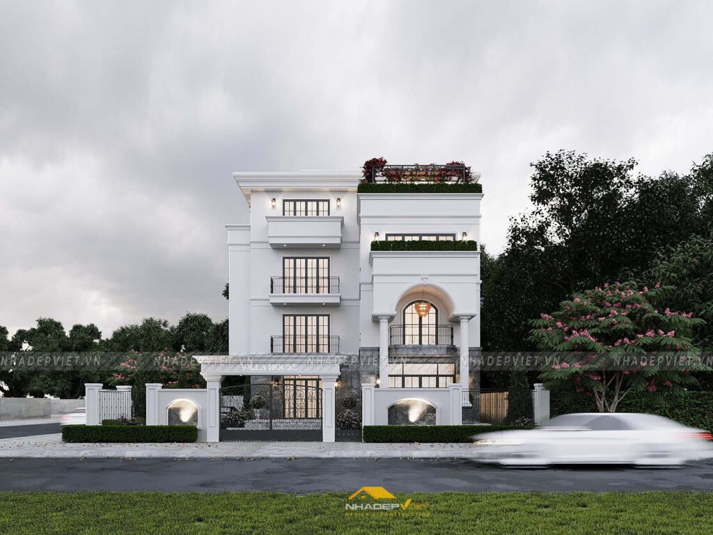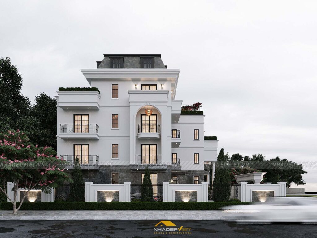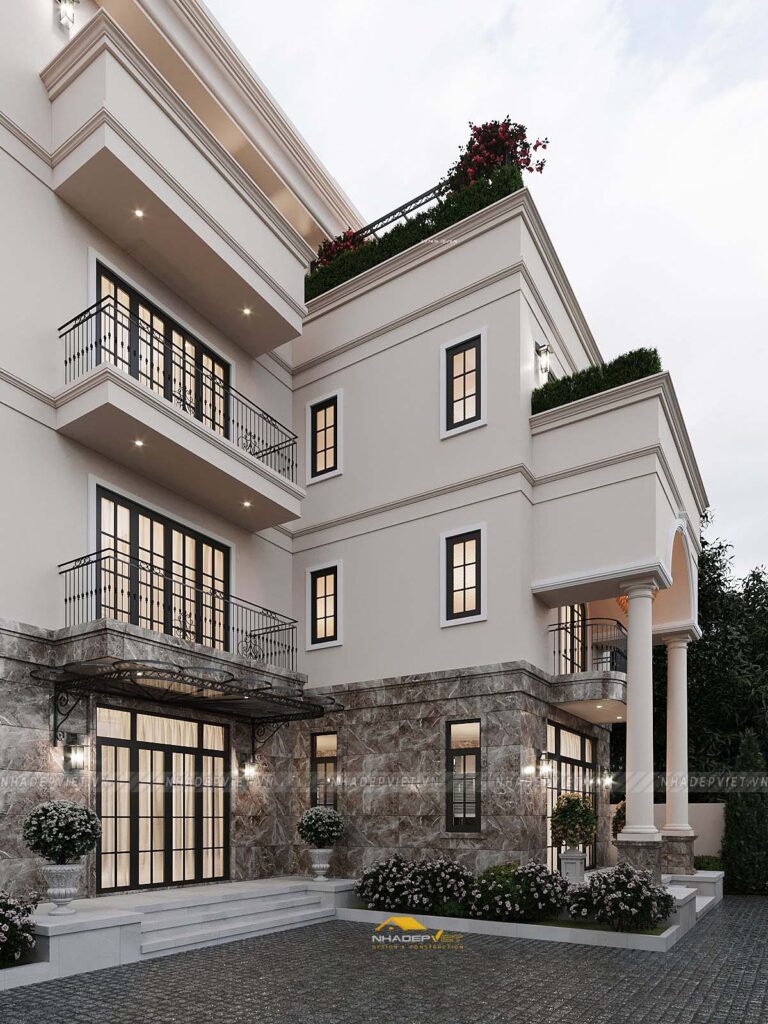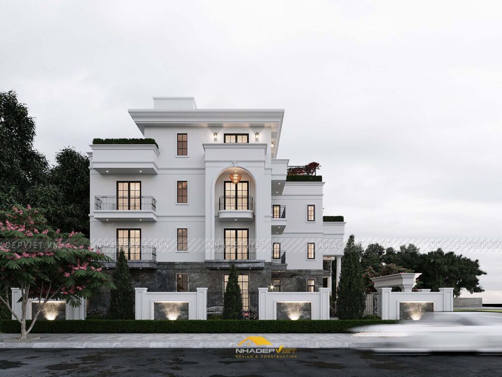 Dự án biệt thự tân cổ điển nổi bật với mặt tiền rộng 8 m, hệ mái Mansard cùng phào chỉ tinh xảo và cột trụ thanh thoát, tạo nên vẻ quý phái đúng chuẩn phong cách Pháp. Tổng thể kiến trúc đối xứng hài hòa, kết hợp tông màu trắng – kem trang nhã và cửa kính lớn giúp ánh sáng tự nhiên tràn ngập không gian sống. Các chi tiết như lan can hoa văn, cửa vòm cổ kính, đá ốp chân móng được kết hợp khéo léo, tạo nên sự hài hòa giữa cổ điển và hiện đại. Bên cạnh đó, không gian sân vườn được thiết kế xen mảng xanh vừa đủ, tô điểm thêm vẻ ấm áp mà vẫn giữ được sự bề thế cho căn biệt thự. Công trình đánh dấu dấu ấn đẳng cấp, thể hiện phong cách sống thượng lưu và gu thẩm mỹ tinh tế của gia chủ.