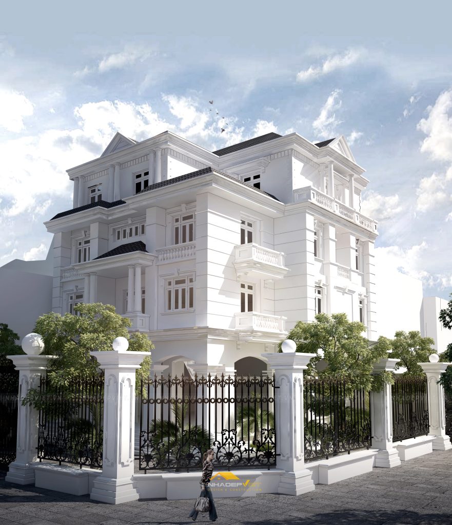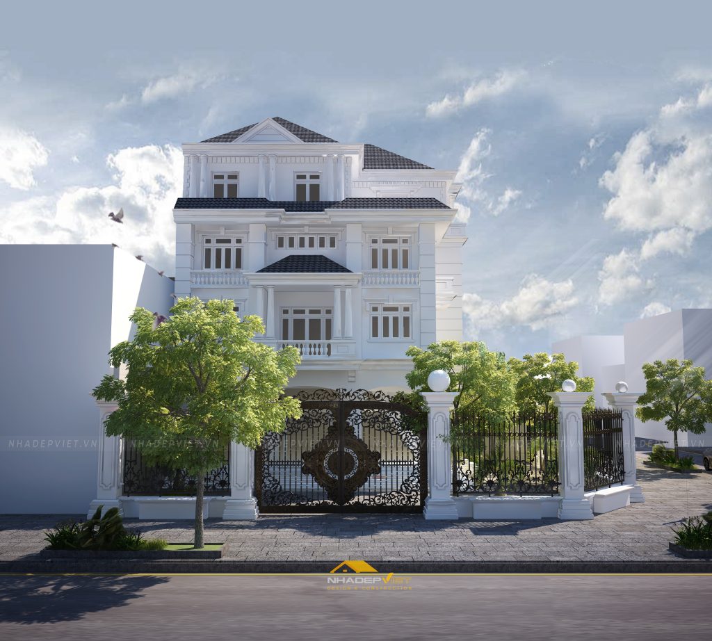 Công trình biệt thự 3 tầng gây ấn tượng mạnh với hình khối vuông vức, mái ngói nhã nhặn và hệ cột đối xứng tạo cảm giác vững chãi, bề thế. Thiết kế mang đậm hơi thở kiến trúc châu Âu với những đường phào chỉ tinh xảo, lan can thanh mảnh và tông màu trắng sang trọng. Tất cả hòa quyện trong không gian sân vườn xanh mát, góp phần nâng tầm phong cách sống cho gia chủ. Đây là mẫu biệt thự lý tưởng dành cho những ai tìm kiếm sự đẳng cấp và tinh tế trong từng chi tiết.