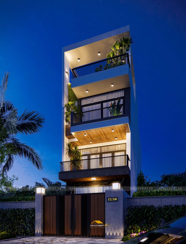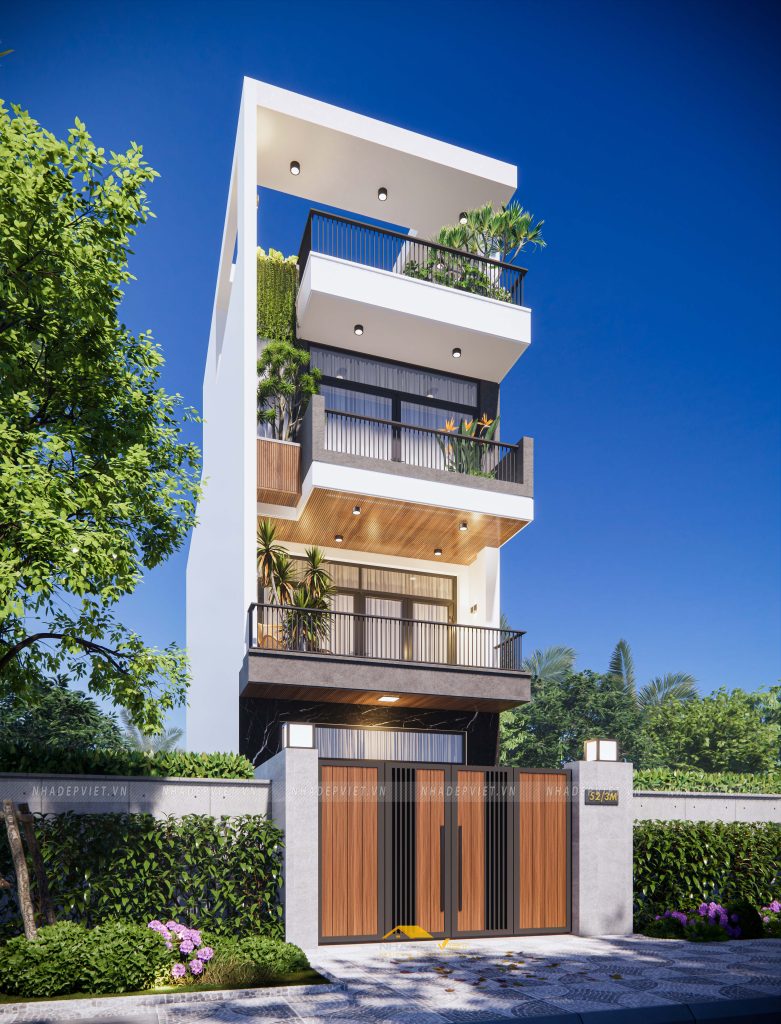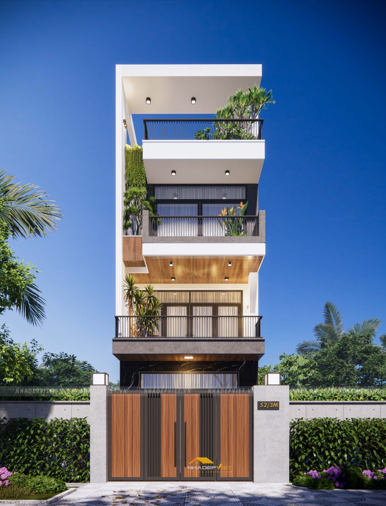 Chiêm ngưỡng tuyệt tác nhà ống hiện đại, nơi mỗi tầng là một khu vườn thu nhỏ, mang đến không gian sống trong lành và tràn đầy năng lượng. Mặt tiền ngôi nhà ấn tượng với các khối kiến trúc vững chắc, kết hợp hài hòa giữa gam màu trắng tinh khôi, vật liệu ốp đá sang trọng và đặc biệt là hệ thống ban công xanh mát, được bố trí tinh tế. Hệ lam gỗ độc đáo ở tầng hai tạo điểm nhấn ấm cúng, trong khi cổng gỗ hiện đại càng tăng thêm vẻ sang trọng. Đây không chỉ là một ngôi nhà, mà còn là biểu tượng của phong cách sống tiện nghi, đẳng cấp và gần gũi với thiên nhiên ngay giữa đô thị sầm uất.