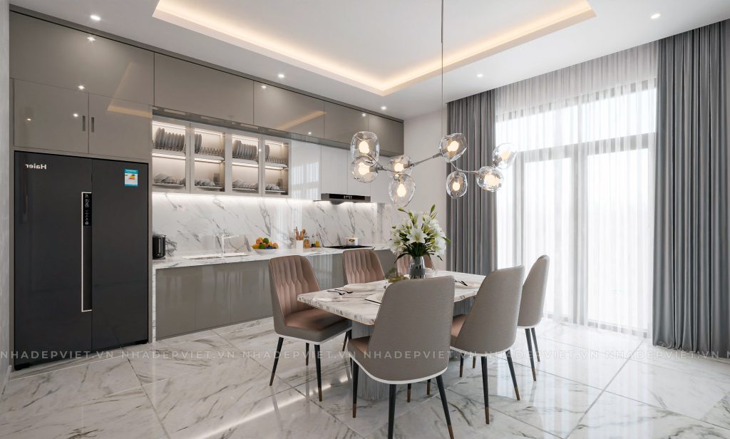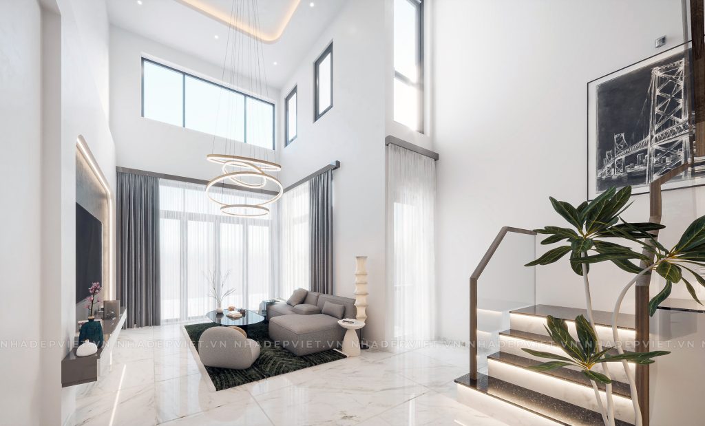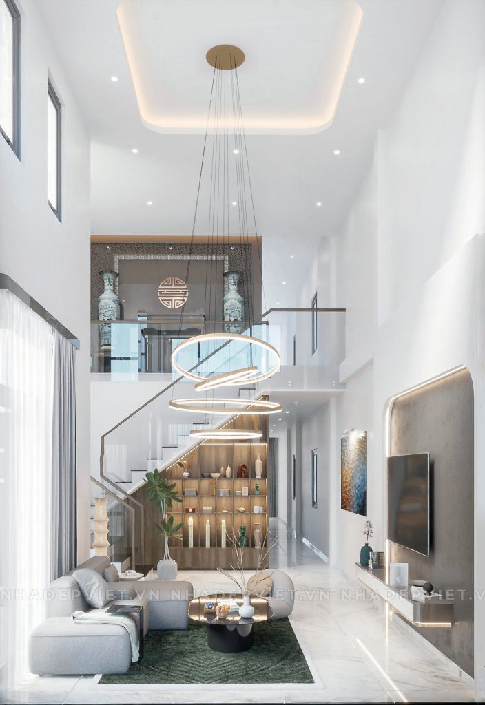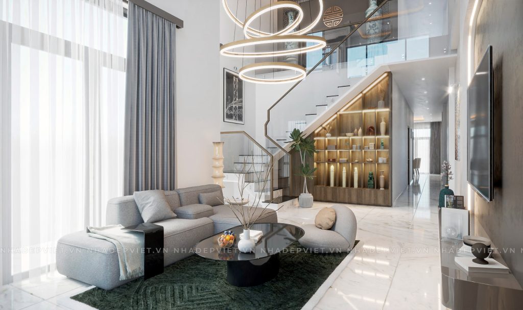 Bên trong, không gian phòng khách được thiết kế mở, ngập tràn ánh sáng tự nhiên, nổi bật với cầu thang kính hiện đại và kệ trang trí âm tường độc đáo. Đèn chùm nghệ thuật và thảm trải sàn màu xanh đậm tạo điểm nhấn sang trọng, khẳng định gu thẩm mỹ của gia chủ. Đây không chỉ là một ngôi nhà, mà còn là tổ ấm lý tưởng, nơi bạn tận hưởng cuộc sống hiện đại và tiện nghi.