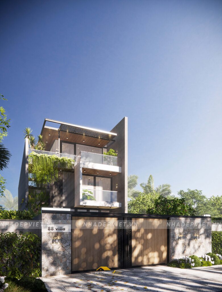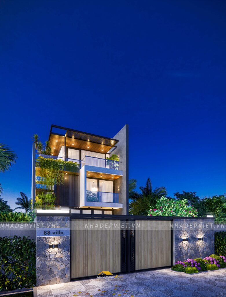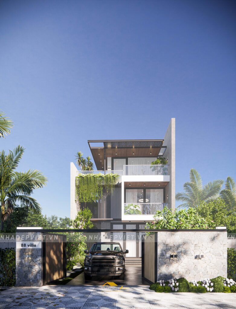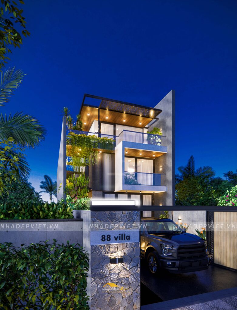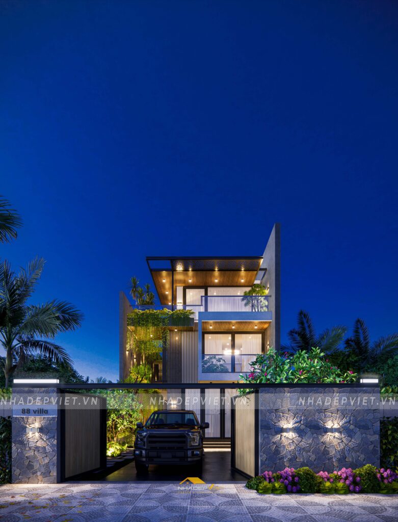 88Villa là một công trình biệt thự mang phong cách hiện đại, gây ấn tượng mạnh bởi thiết kế hồ cá koi độc đáo chạy dọc bên hông nhà – như một dòng suối nhỏ dẫn lối thiên nhiên chảy vào từng không gian sống. Tổng thể kiến trúc sử dụng ngôn ngữ hình khối đơn giản, mạch lạc, nhưng được làm mềm lại bởi hệ sinh thái nước, cây xanh và ánh sáng tự nhiên đan cài khéo léo. Không gian bên trong biệt thự được tổ chức mở, thông thoáng, giúp kết nối liền mạch giữa con người và thiên nhiên bên ngoài. Mỗi bước chân qua hành lang bên hồ đều gợi cảm giác thư giãn, thiền tịnh, lý tưởng cho một lối sống chậm và sâu sắc. Đây không chỉ là nơi ở, mà còn là một trải nghiệm sống nghệ thuật – nơi người ta có thể cảm nhận sự bình yên, tinh tế và cá tính trong từng chi tiết nhỏ. 88Villa chính là minh chứng cho xu hướng kiến trúc hiện đại biết lắng nghe và giao hòa cùng thiên nhiên.
