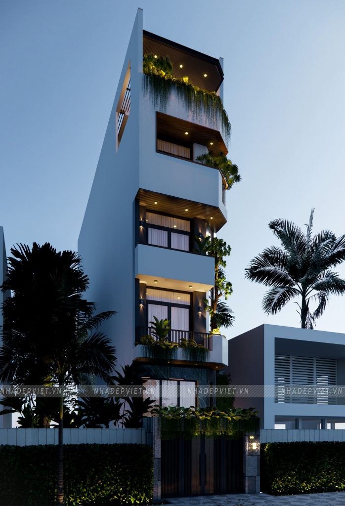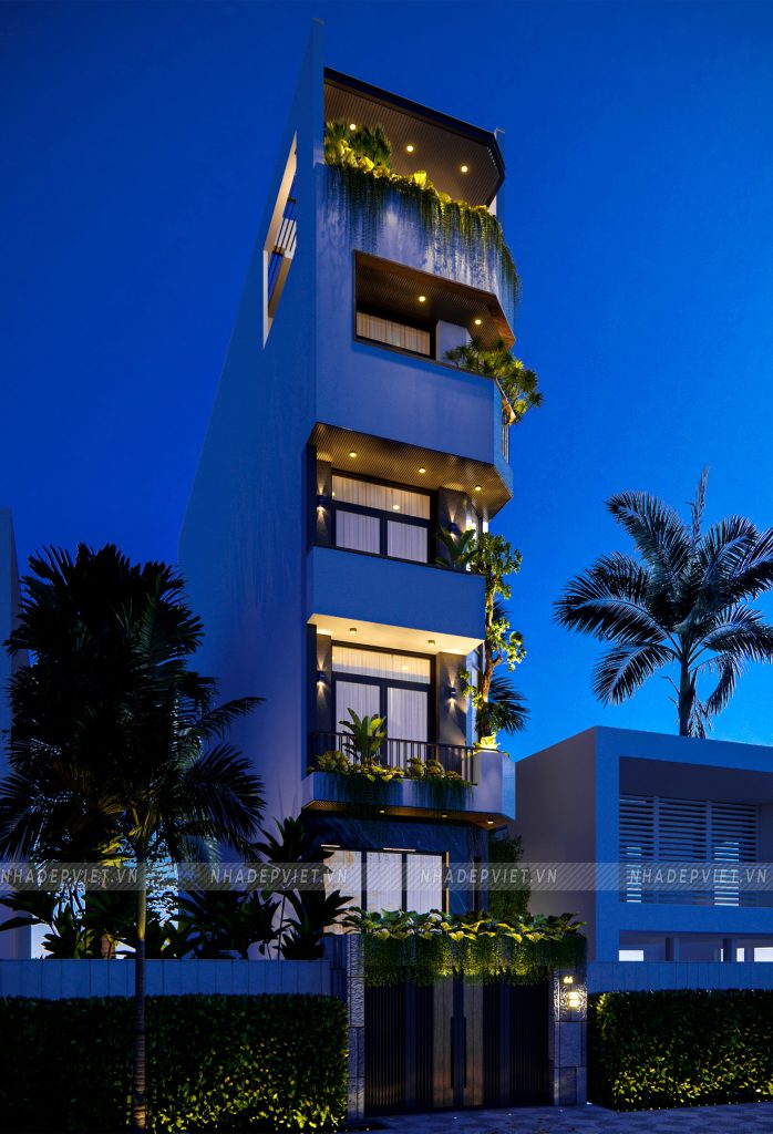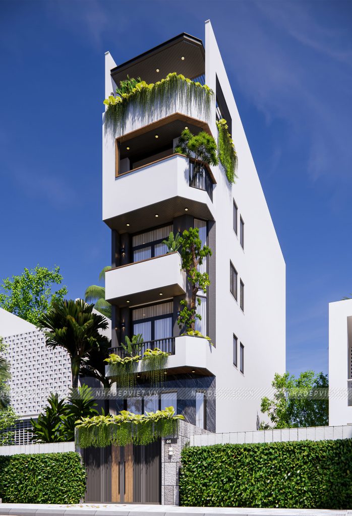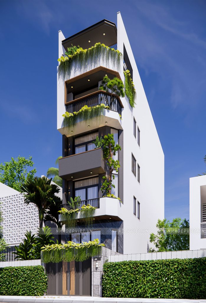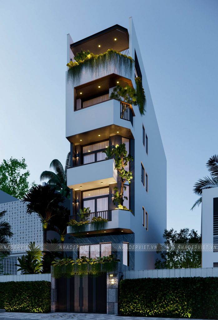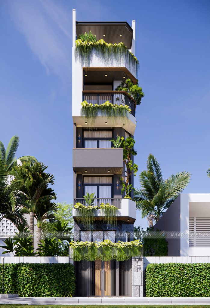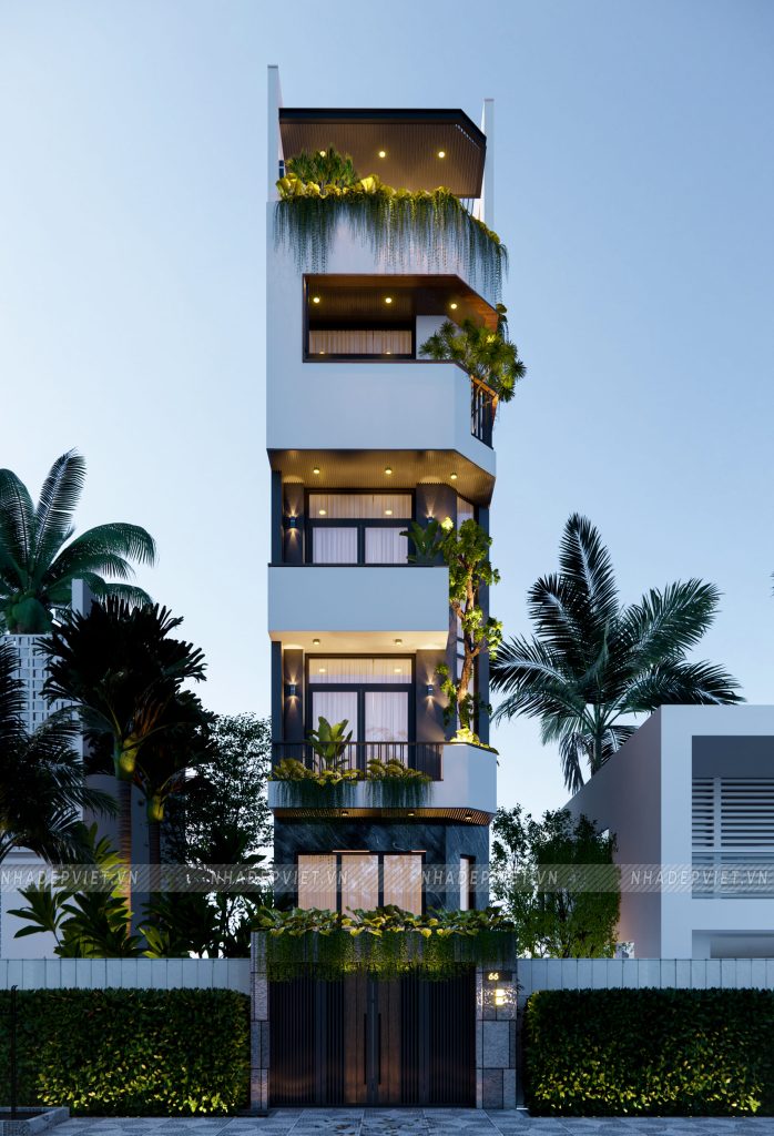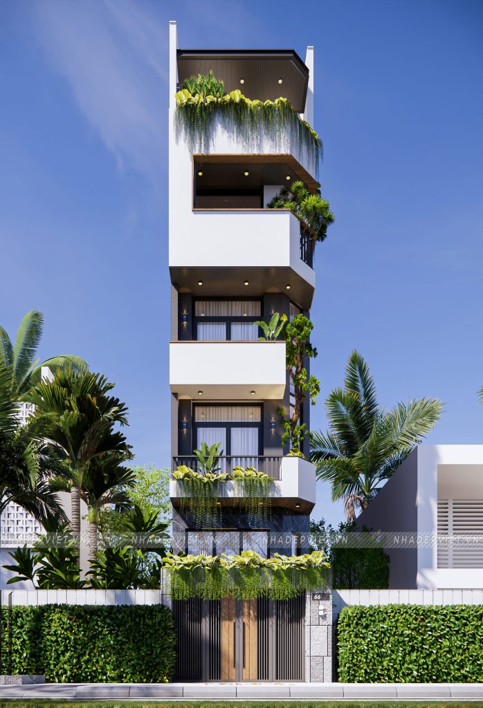 Mẫu nhà phố 5 tầng mang đến một diện mạo hiện đại, sang trọng và đầy sức sống. Điểm nhấn đặc biệt là những mảng xanh được bố trí khéo léo ở ban công và mặt tiền, vừa tạo nét mềm mại cho kiến trúc vuông vức, vừa mang đến không khí trong lành cho không gian sống. Sự kết hợp hài hòa giữa gam màu trắng tinh tế, chất liệu ốp đá sang trọng và cây xanh mát mắt giúp công trình nổi bật giữa phố thị, trở thành lựa chọn lý tưởng cho gia đình yêu thích phong cách sống xanh và tiện nghi.