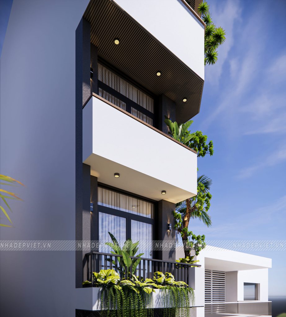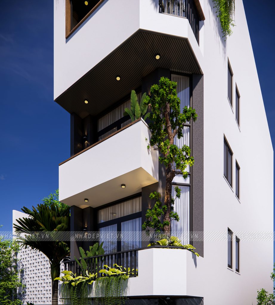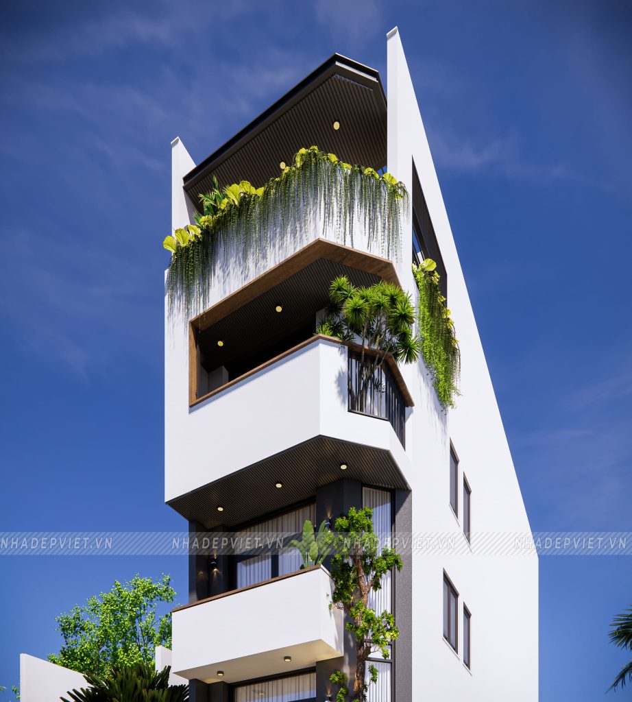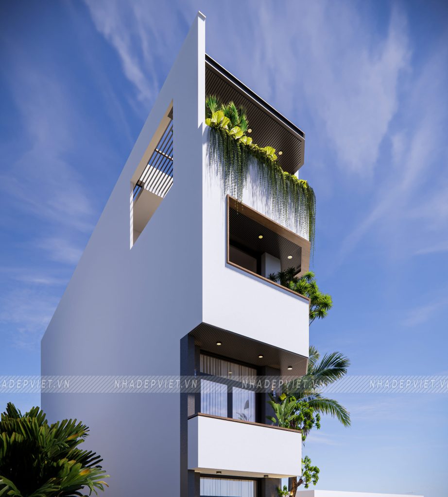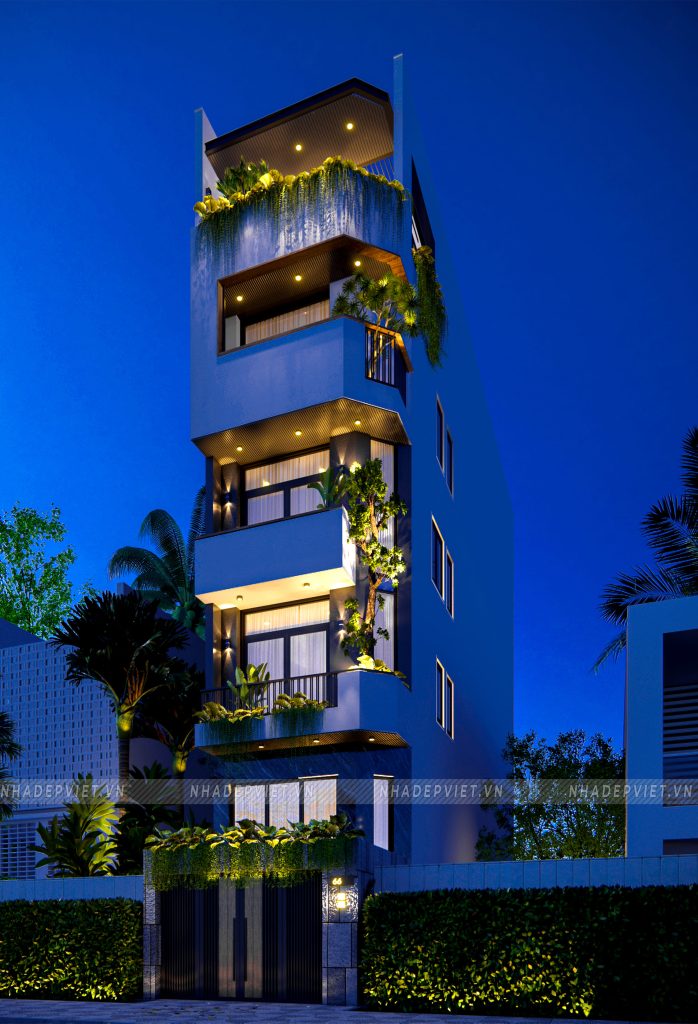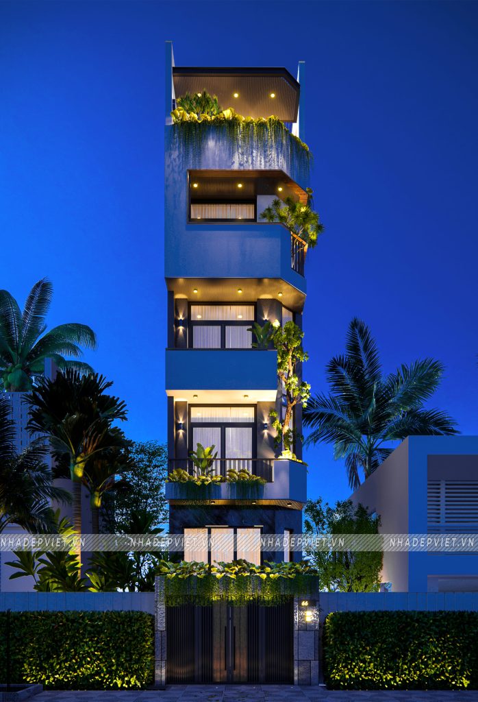 Mẫu nhà phố 5 tầng mang đến một diện mạo hiện đại, sang trọng và đầy sức sống. Điểm nhấn đặc biệt là những mảng xanh được bố trí khéo léo ở ban công và mặt tiền, vừa tạo nét mềm mại cho kiến trúc vuông vức, vừa mang đến không khí trong lành cho không gian sống. Sự kết hợp hài hòa giữa gam màu trắng tinh tế, chất liệu ốp đá sang trọng và cây xanh mát mắt giúp công trình nổi bật giữa phố thị, trở thành lựa chọn lý tưởng cho gia đình yêu thích phong cách sống xanh và tiện nghi.