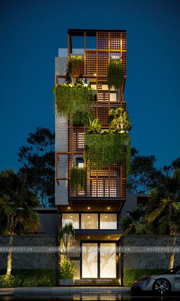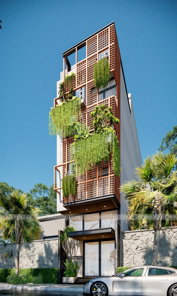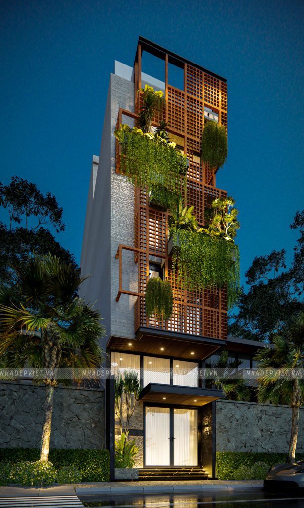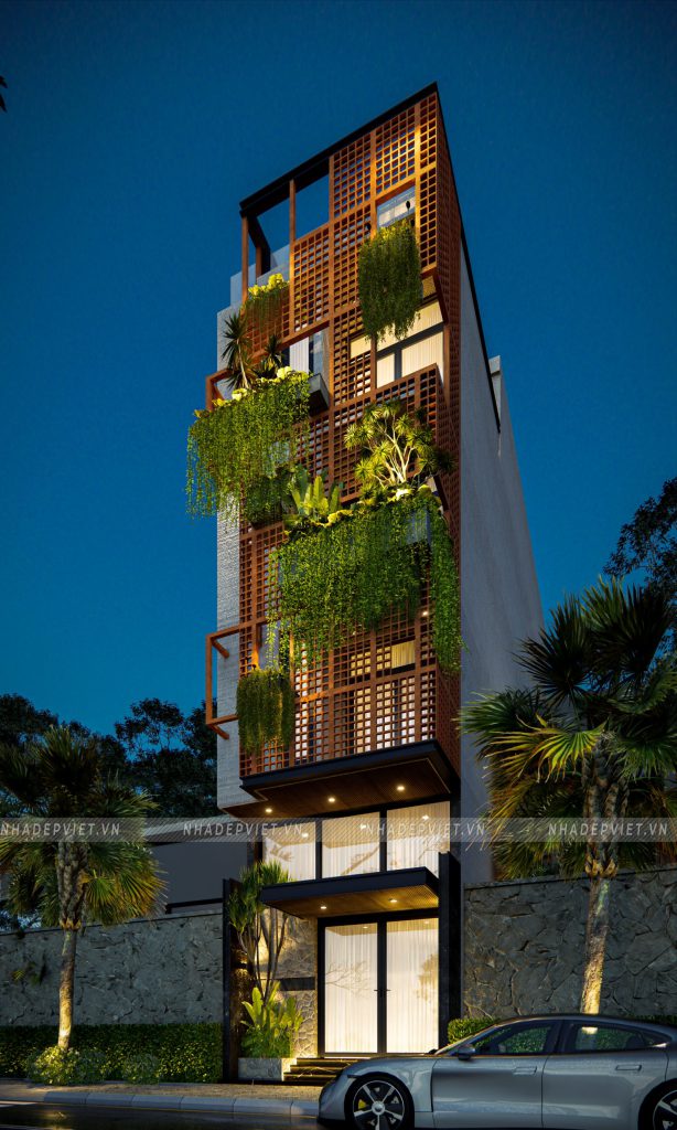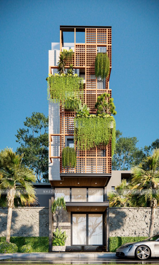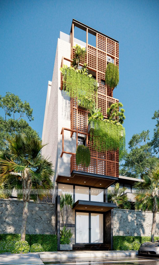 Ngôi nhà phố 4 tầng này như được khoác lên mình “chiếc áo” sống động với hệ lam gạch hoa gió kết hợp cùng mảng xanh tươi mát. Gạch hoa gió không chỉ tạo nên hiệu ứng bóng – sáng khúc xạ mềm mại mà còn giúp điều hòa nhiệt độ, lưu thông gió tự nhiên, mang lại cảm giác mát mẻ quanh năm. Xen kẽ giữa các ô gió, những chậu cây treo và giàn leo xanh ngát vừa tô điểm vẻ đẹp thẩm mỹ, vừa cải thiện chất lượng không khí, kéo gần khoảng cách giữa con người và thiên nhiên ngay trong không gian đô thị.