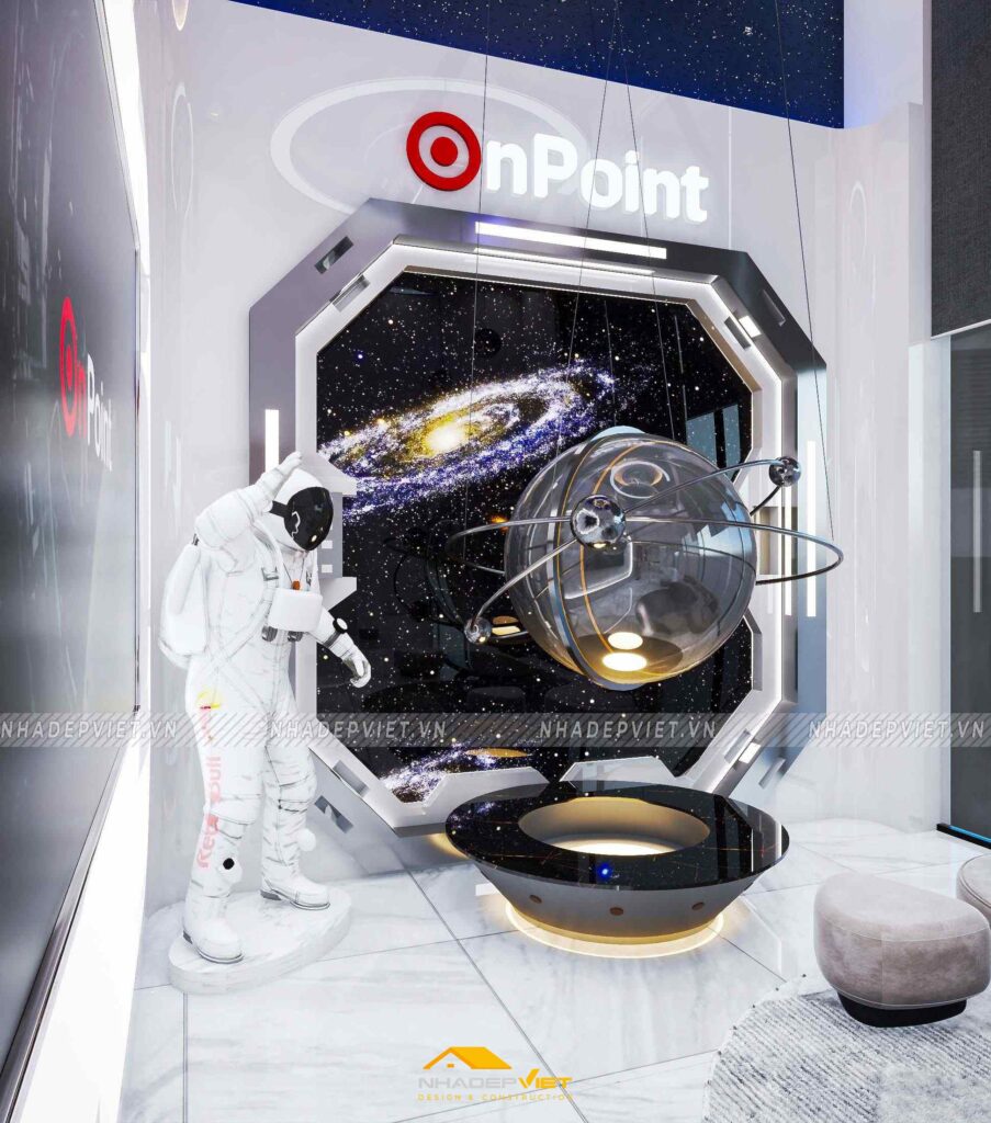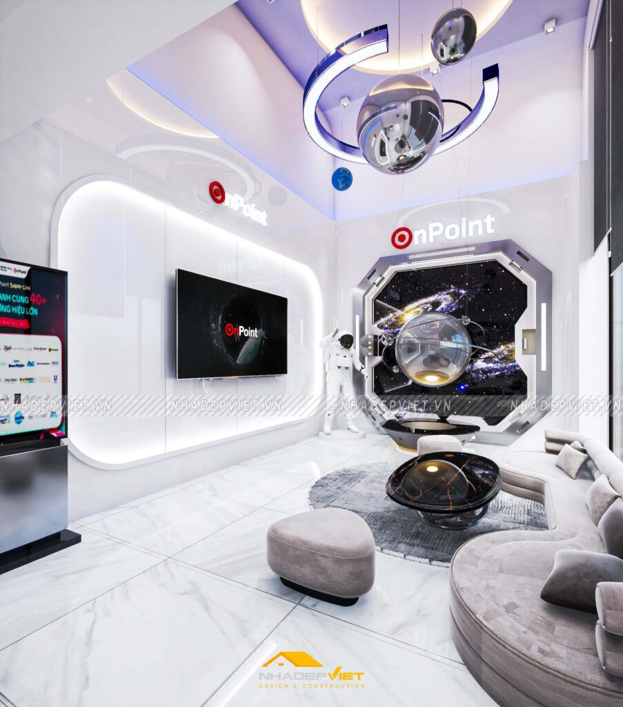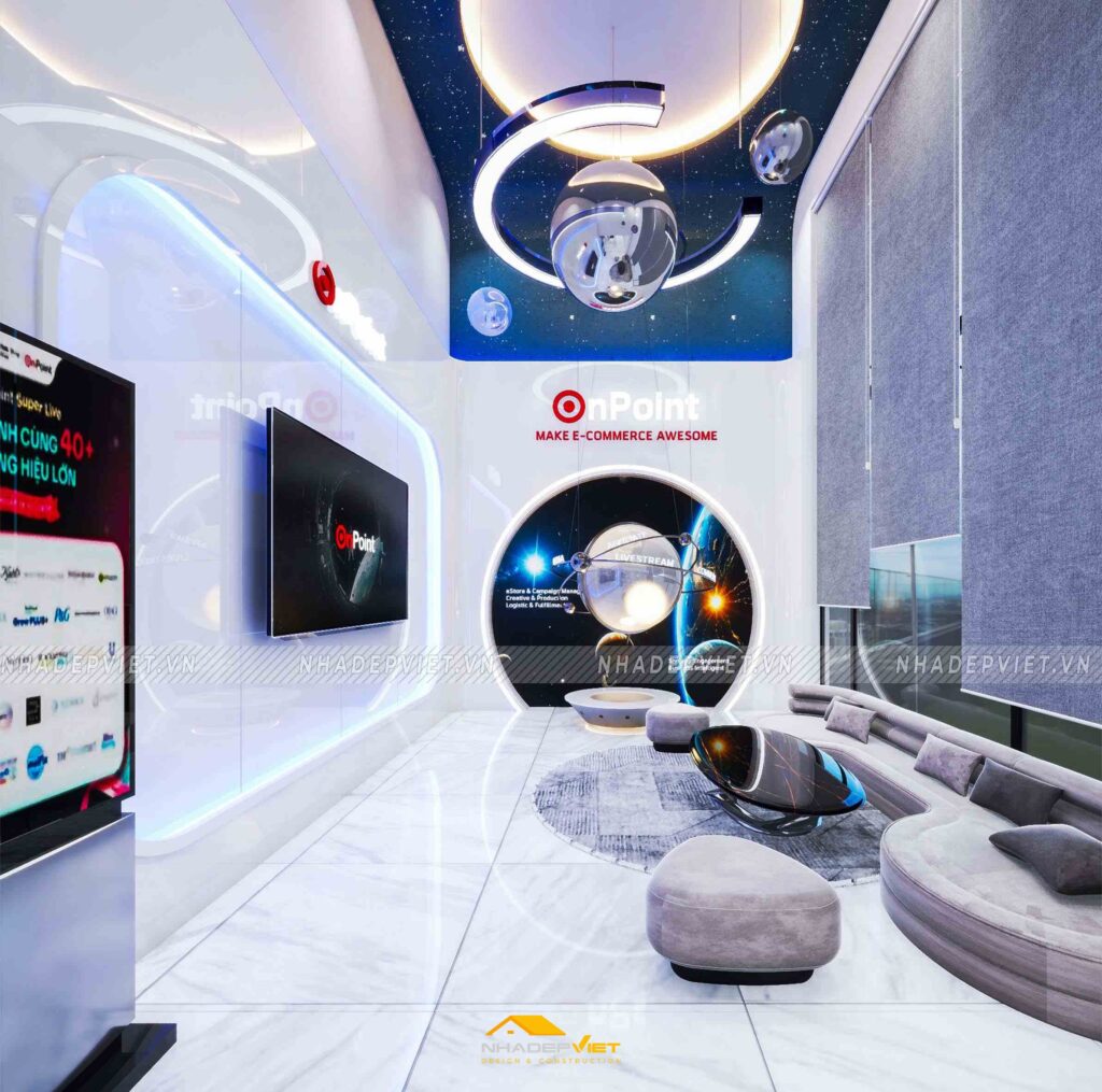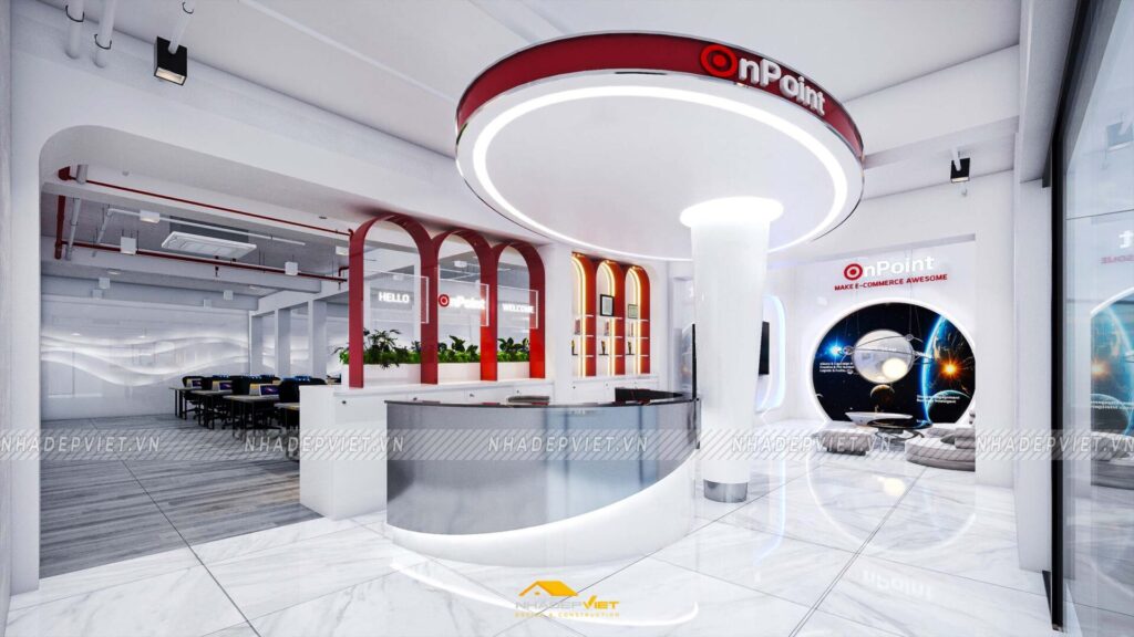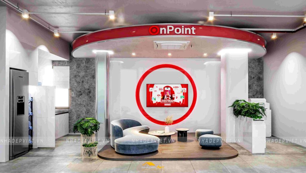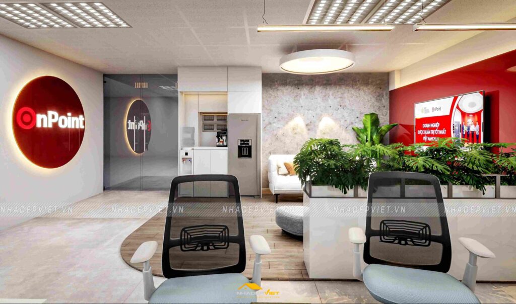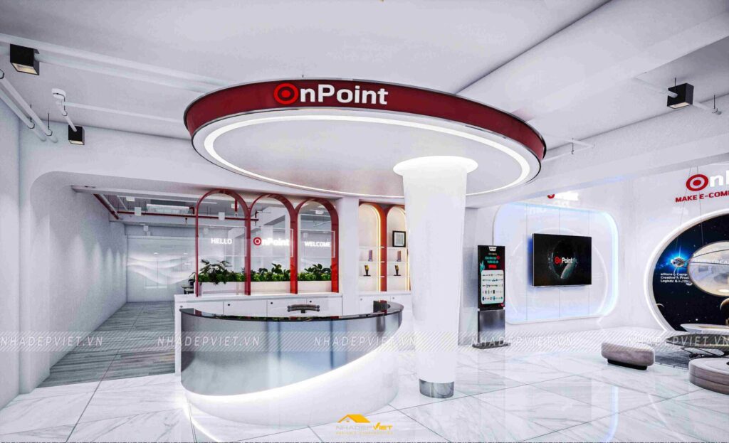 Văn phòng OnPoint được thiết kế theo phong cách hiện đại, tối giản nhưng vẫn thể hiện dấu ấn thương hiệu rõ nét. Khu vực lễ tân ấn tượng với quầy tiếp khách liền khối, ốp đá vân mây trắng – xám, nổi bật logo công ty bằng chữ kim loại mạ vàng ánh kim. Phía sau quầy là mảng tường nhấn sơn tông xanh dương đậm chủ đạo, kết hợp hệ đèn LED viền âm tường, vừa tạo điểm nhấn vừa dẫn lối ánh sáng dịu nhẹ cho toàn không gian.