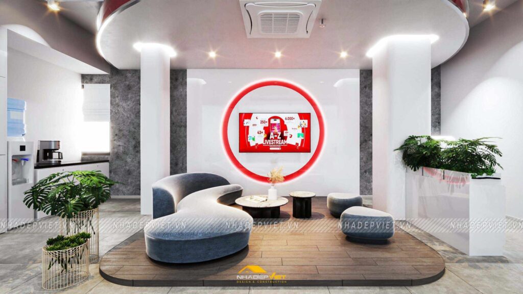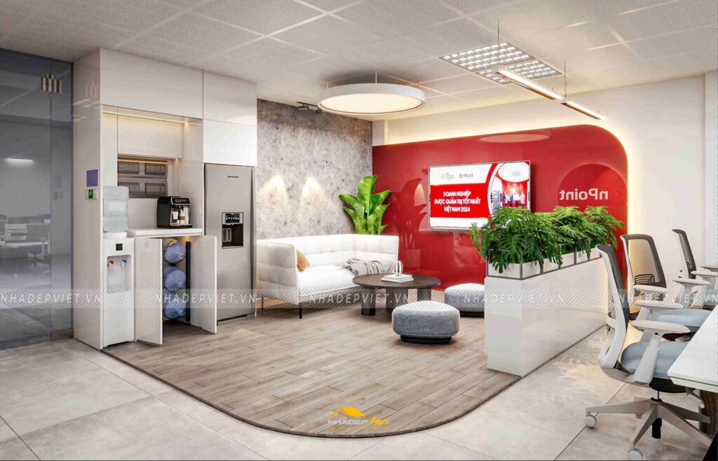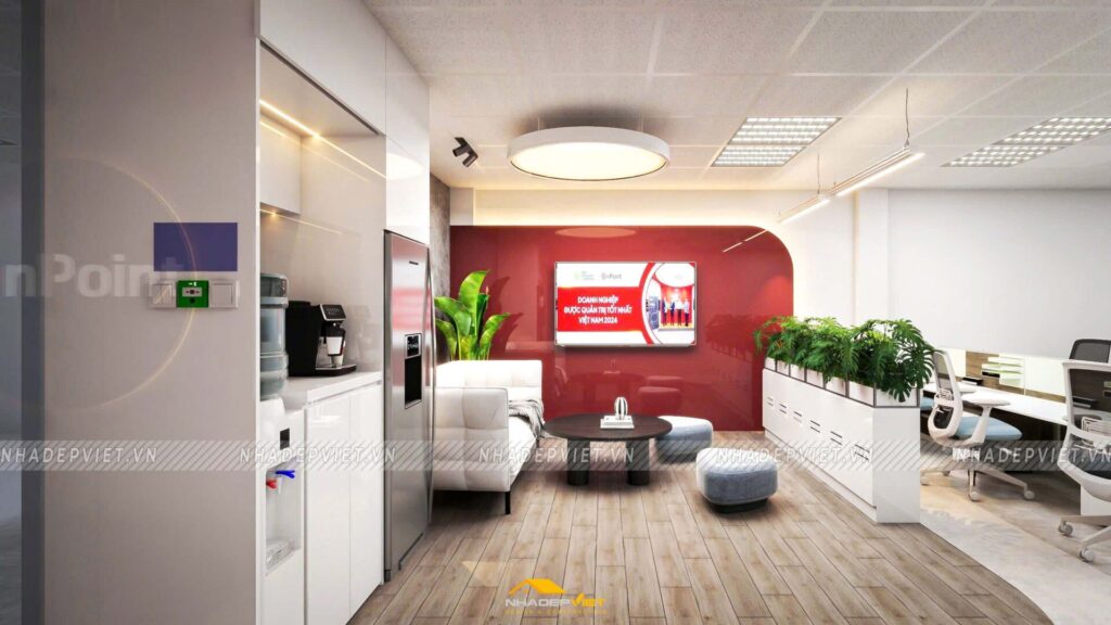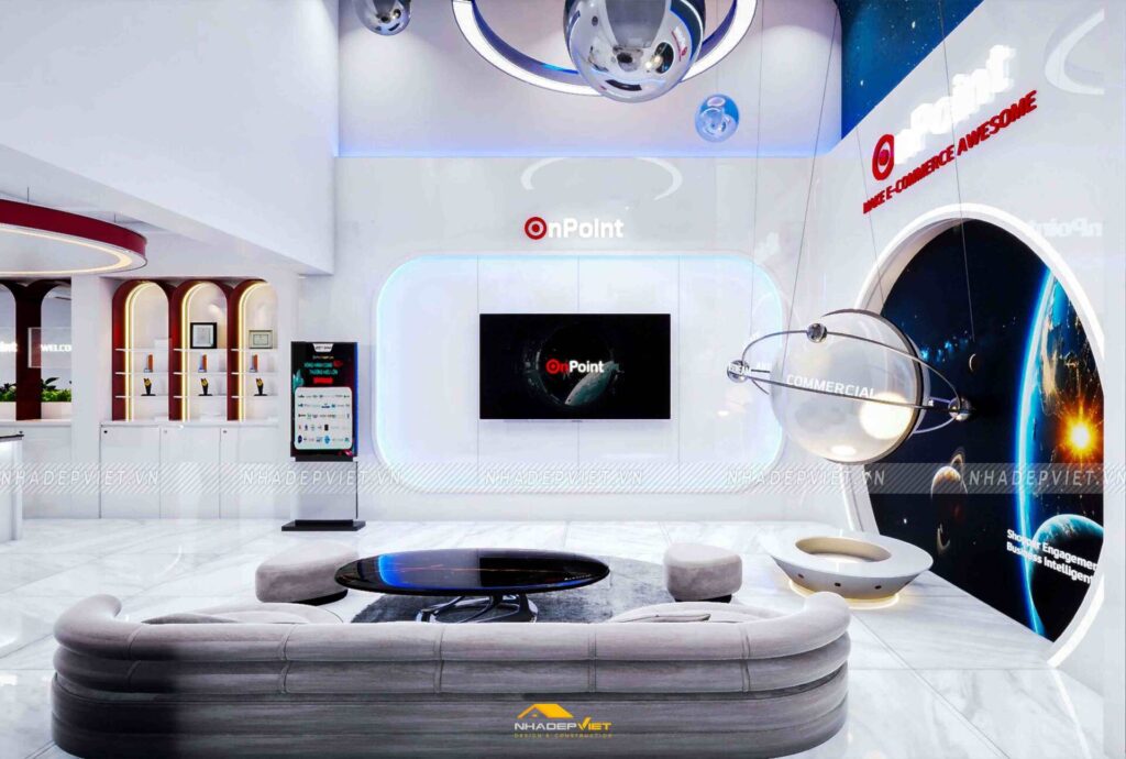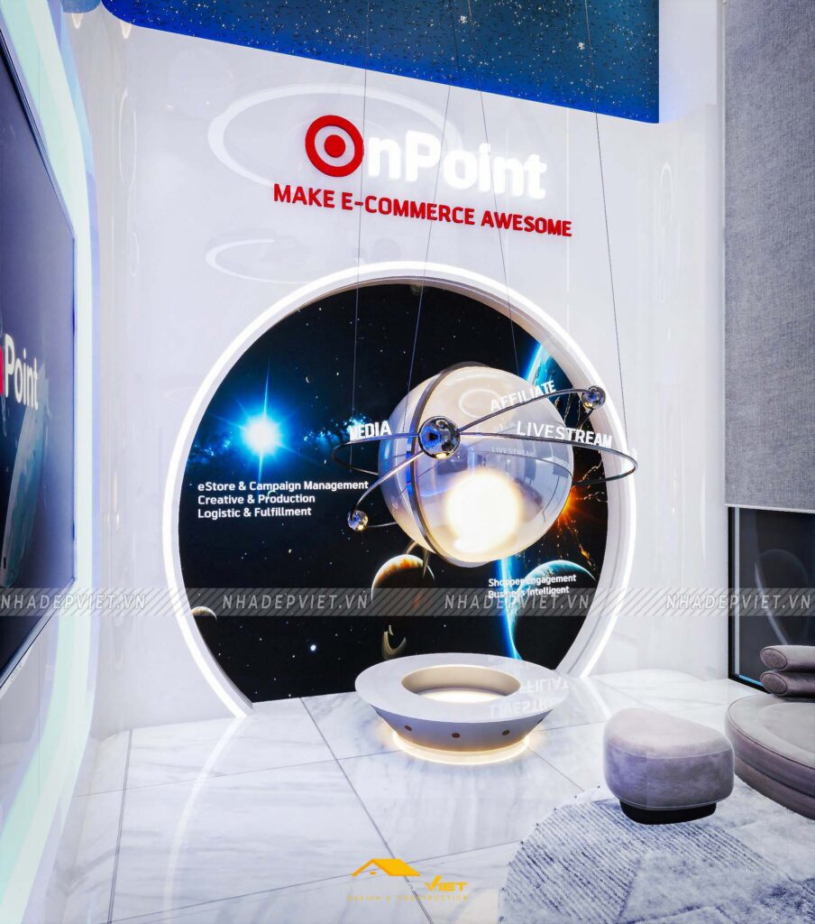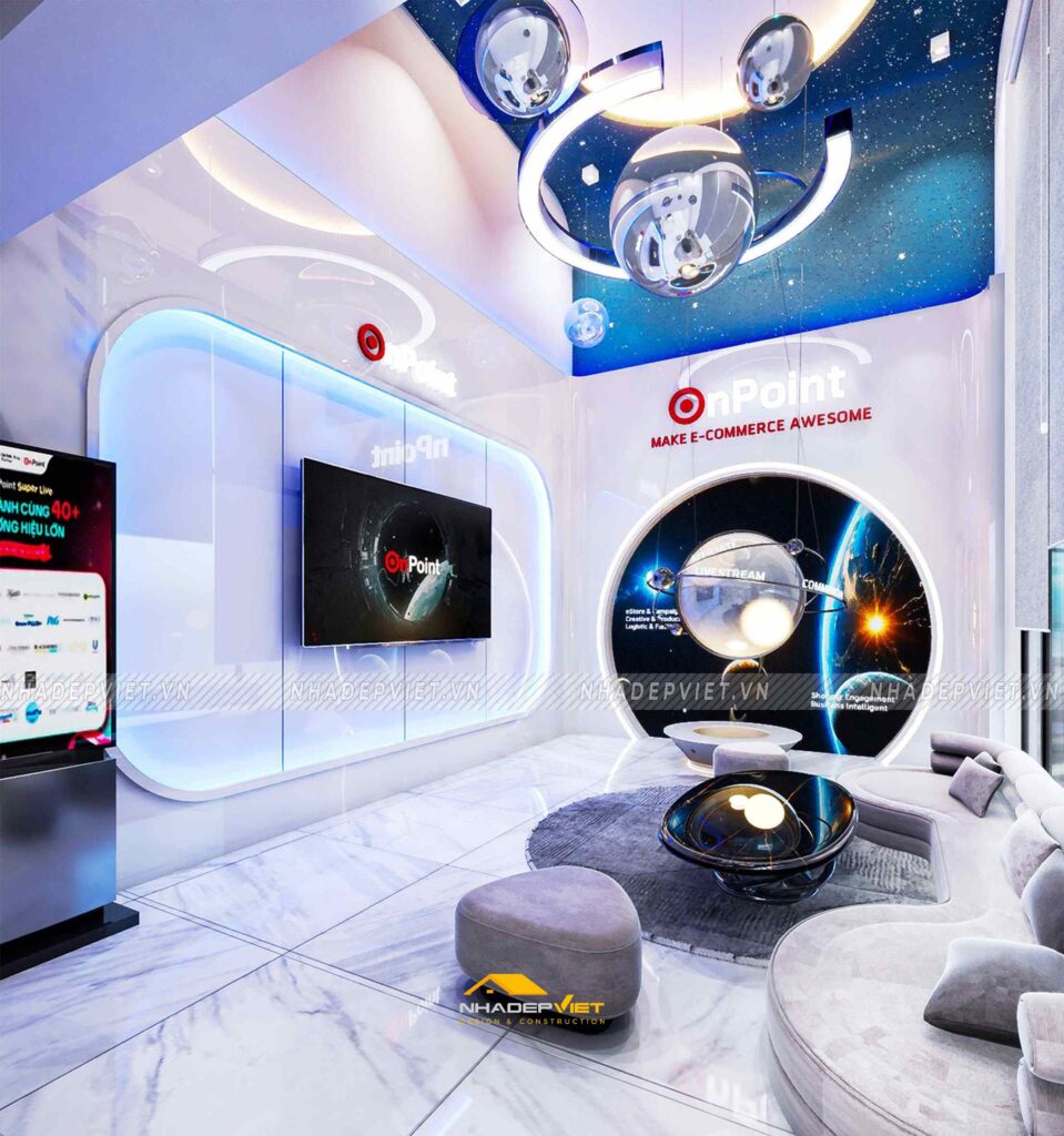 Văn phòng OnPoint được thiết kế theo phong cách hiện đại, tối giản nhưng vẫn thể hiện dấu ấn thương hiệu rõ nét. Khu vực lễ tân ấn tượng với quầy tiếp khách liền khối, ốp đá vân mây trắng – xám, nổi bật logo công ty bằng chữ kim loại mạ vàng ánh kim. Phía sau quầy là mảng tường nhấn sơn tông xanh dương đậm chủ đạo, kết hợp hệ đèn LED viền âm tường, vừa tạo điểm nhấn vừa dẫn lối ánh sáng dịu nhẹ cho toàn không gian.