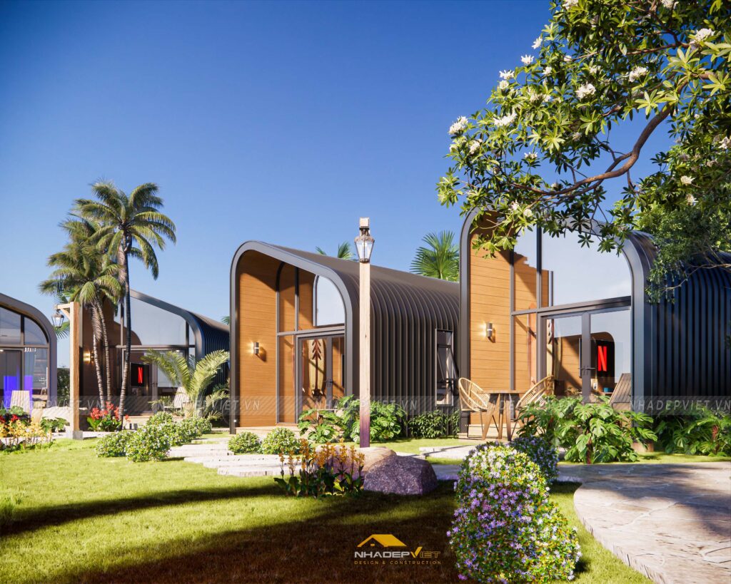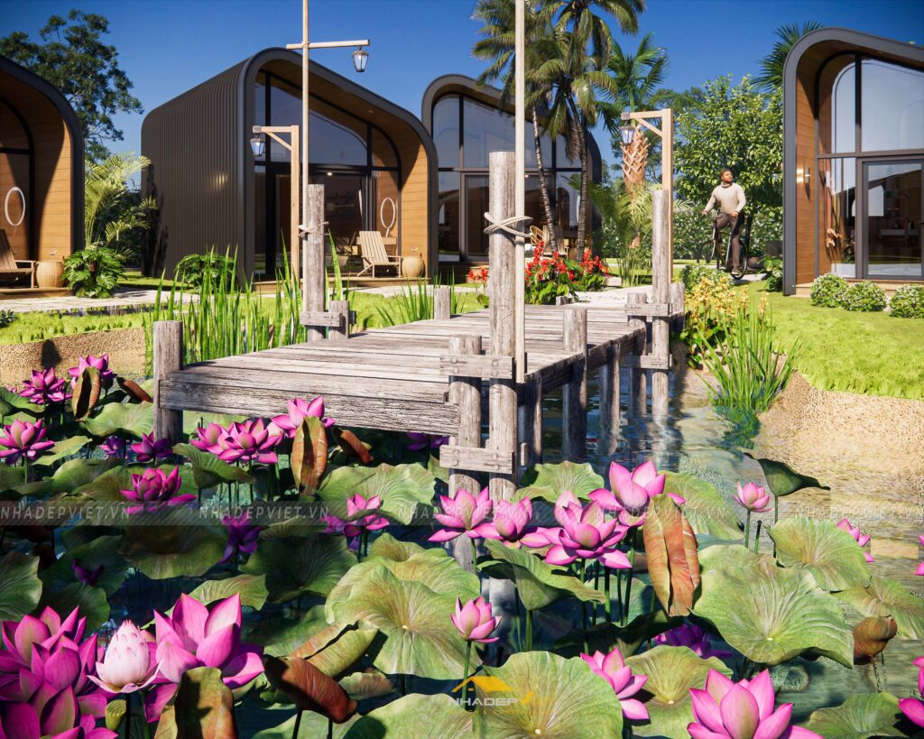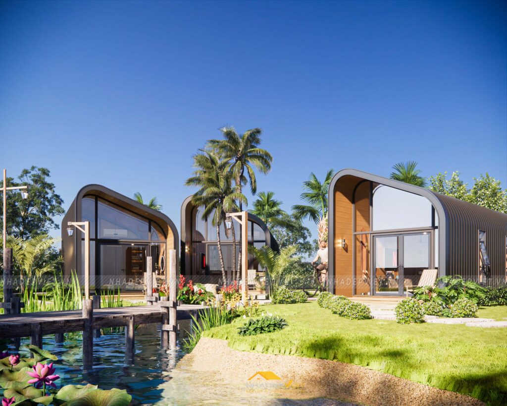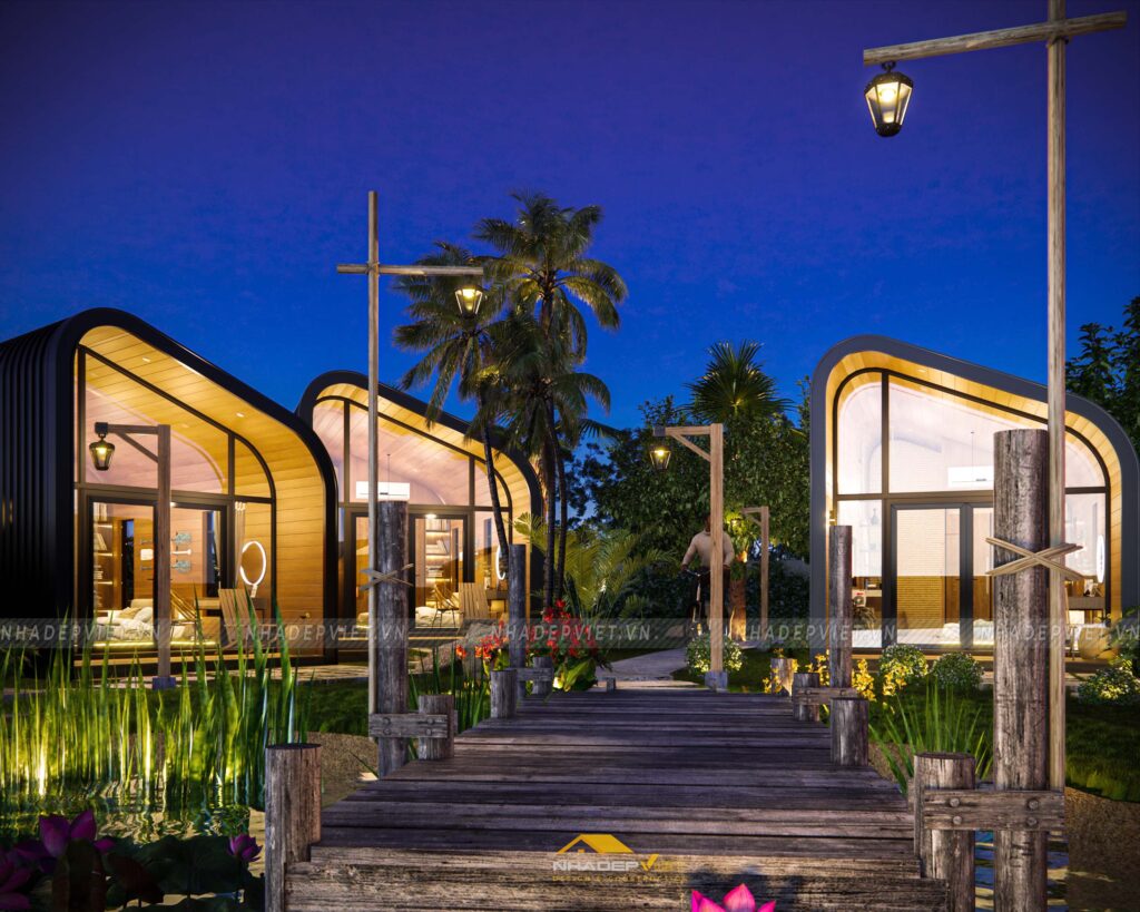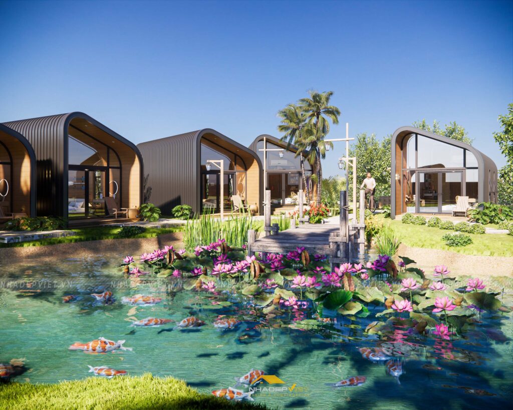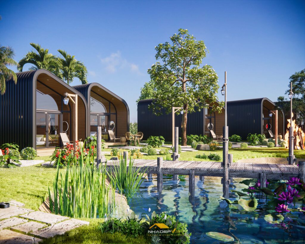 Dự án khu homestay nghỉ dưỡng được thiết kế lấy cảm hứng từ thiên nhiên, với không gian mở rộng thoáng, nhiều cây xanh và hồ nước tạo nên sự thư giãn tuyệt đối cho du khách. Các bungalow được bố trí xen kẽ khéo léo, sử dụng vật liệu tự nhiên như gỗ, tre nứa cùng mái lá truyền thống, mang lại cảm giác gần gũi và mộc mạc nhưng không kém phần tiện nghi hiện đại. Nội thất bên trong chú trọng sự tối giản, tinh tế, giúp du khách dễ dàng tận hưởng sự yên bình và riêng tư. Hệ thống lối đi và sân vườn được chăm chút kỹ lưỡng, kết nối hài hòa các khu vực, tạo nên tổng thể vừa thẩm mỹ vừa thân thiện với môi trường. Đây thực sự là điểm đến lý tưởng cho những ai muốn tìm kiếm sự nghỉ ngơi, thư giãn giữa thiên nhiên trong không gian đậm chất văn hóa bản địa.