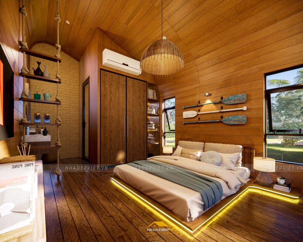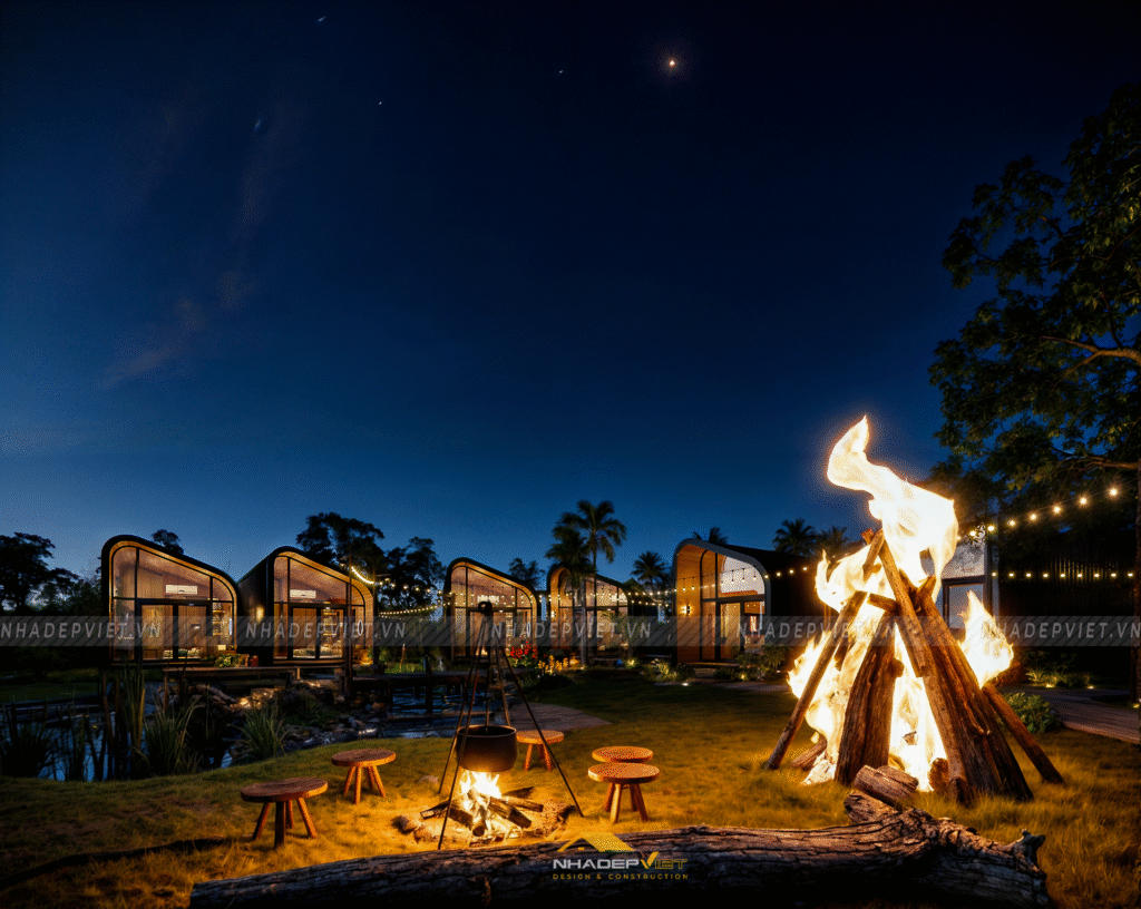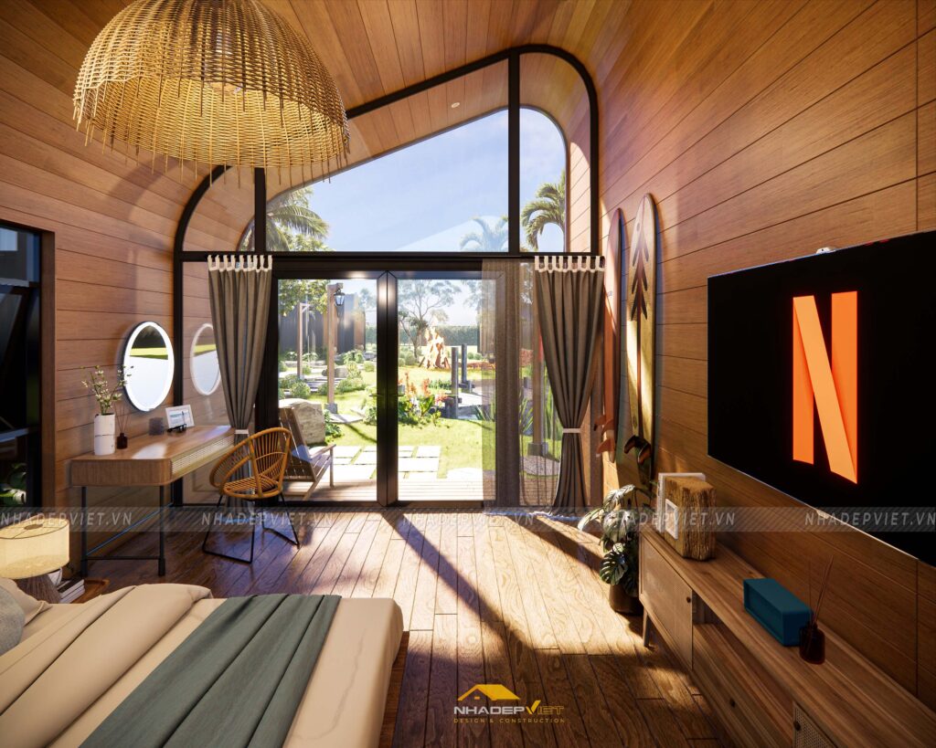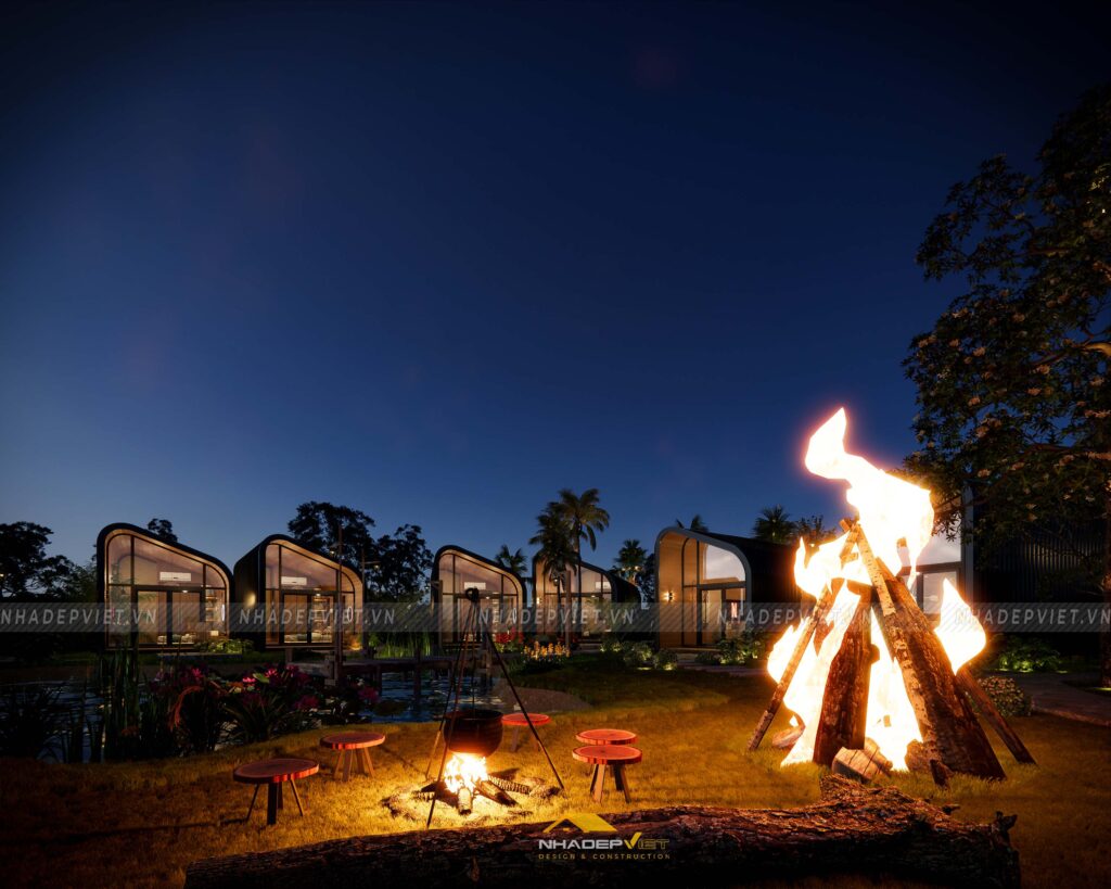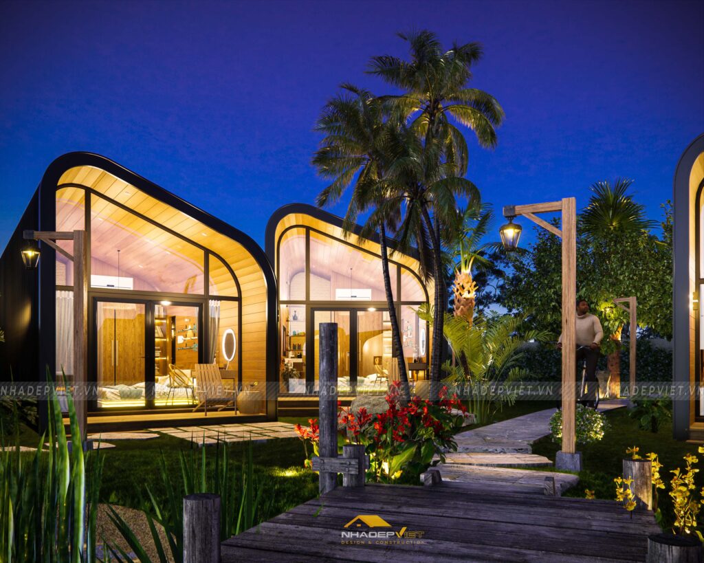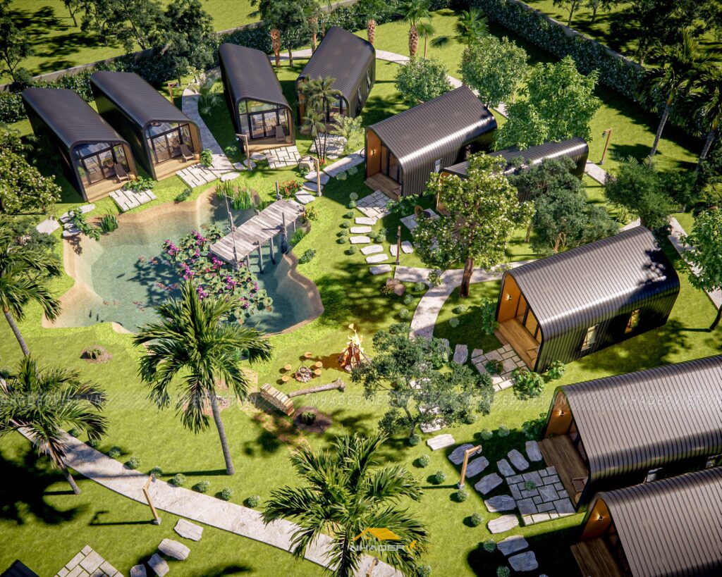 Dự án khu homestay nghỉ dưỡng được thiết kế lấy cảm hứng từ thiên nhiên, với không gian mở rộng thoáng, nhiều cây xanh và hồ nước tạo nên sự thư giãn tuyệt đối cho du khách. Các bungalow được bố trí xen kẽ khéo léo, sử dụng vật liệu tự nhiên như gỗ, tre nứa cùng mái lá truyền thống, mang lại cảm giác gần gũi và mộc mạc nhưng không kém phần tiện nghi hiện đại. Nội thất bên trong chú trọng sự tối giản, tinh tế, giúp du khách dễ dàng tận hưởng sự yên bình và riêng tư. Hệ thống lối đi và sân vườn được chăm chút kỹ lưỡng, kết nối hài hòa các khu vực, tạo nên tổng thể vừa thẩm mỹ vừa thân thiện với môi trường. Đây thực sự là điểm đến lý tưởng cho những ai muốn tìm kiếm sự nghỉ ngơi, thư giãn giữa thiên nhiên trong không gian đậm chất văn hóa bản địa.
