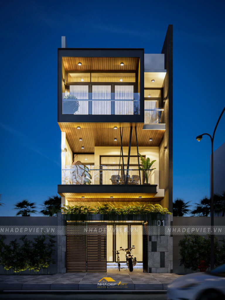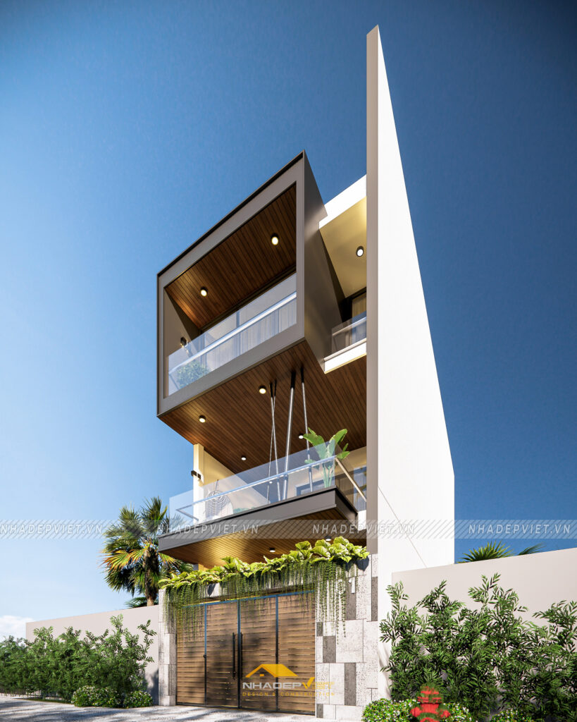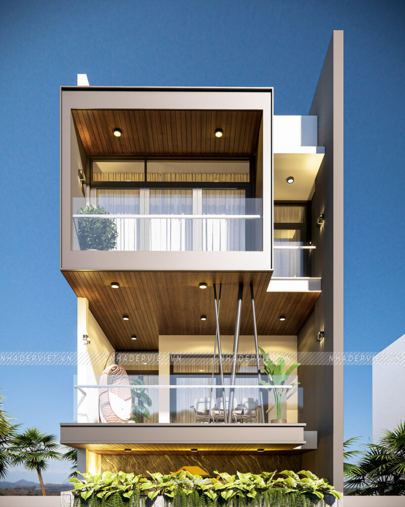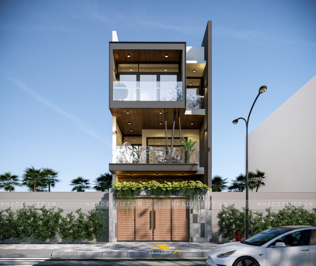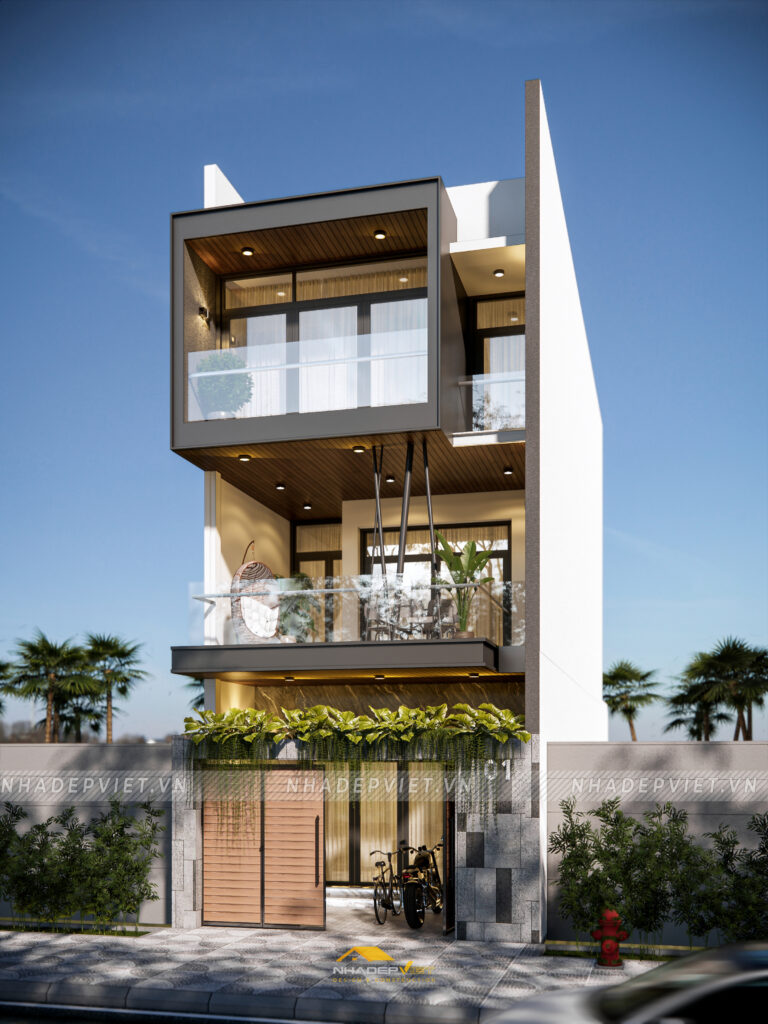 Mẫu nhà phố 6×19 m mang phong cách hiện đại, gây ấn tượng với mặt tiền thiết kế tối giản nhưng đầy tinh tế, hòa hợp giữa gỗ ốp, kính cường lực và màu sơn trắng sáng. Thiết kế hướng đến tối ưu hóa ánh sáng và không gian, với hệ cửa kính rộng và ban công thông thoáng, tạo cảm giác rộng rãi, kết nối trực tiếp với thiên nhiên bên ngoài. Nội thất bên trong được bố trí linh hoạt, tiện nghi cho gia đình, chú trọng công năng sử dụng mà vẫn đảm bảo thẩm mỹ hiện đại. Cảnh quan sân trước tuy đơn giản nhưng được điểm xuyết bởi cây xanh và ánh sáng tự nhiên, góp phần kết nối không gian trong ngoài. Công trình là minh chứng cho lối sống tiện nghi, trẻ trung và đầy cá tính – phù hợp với gia đình hiện đại.