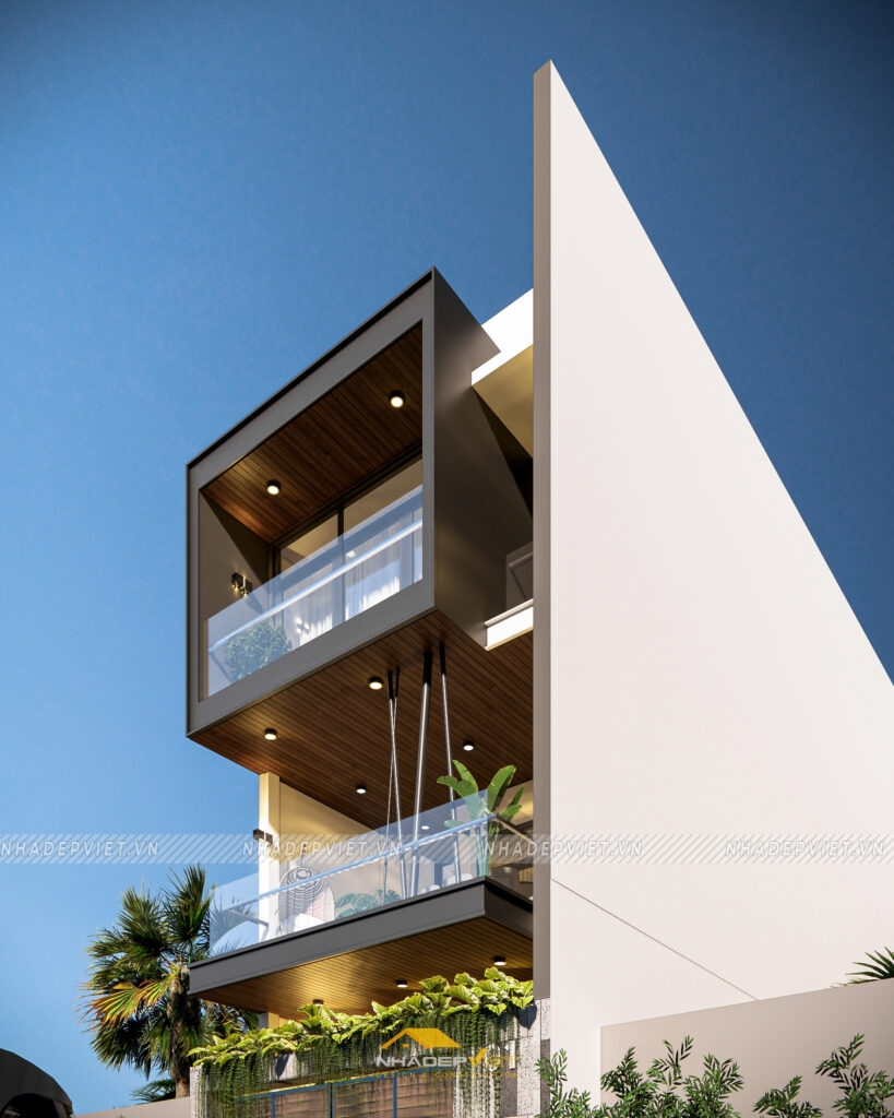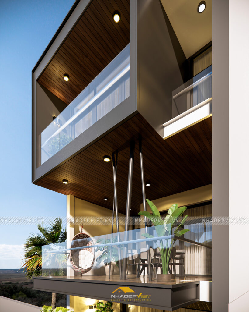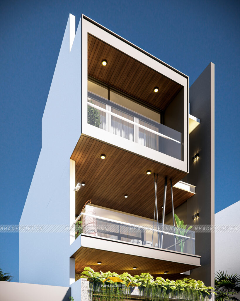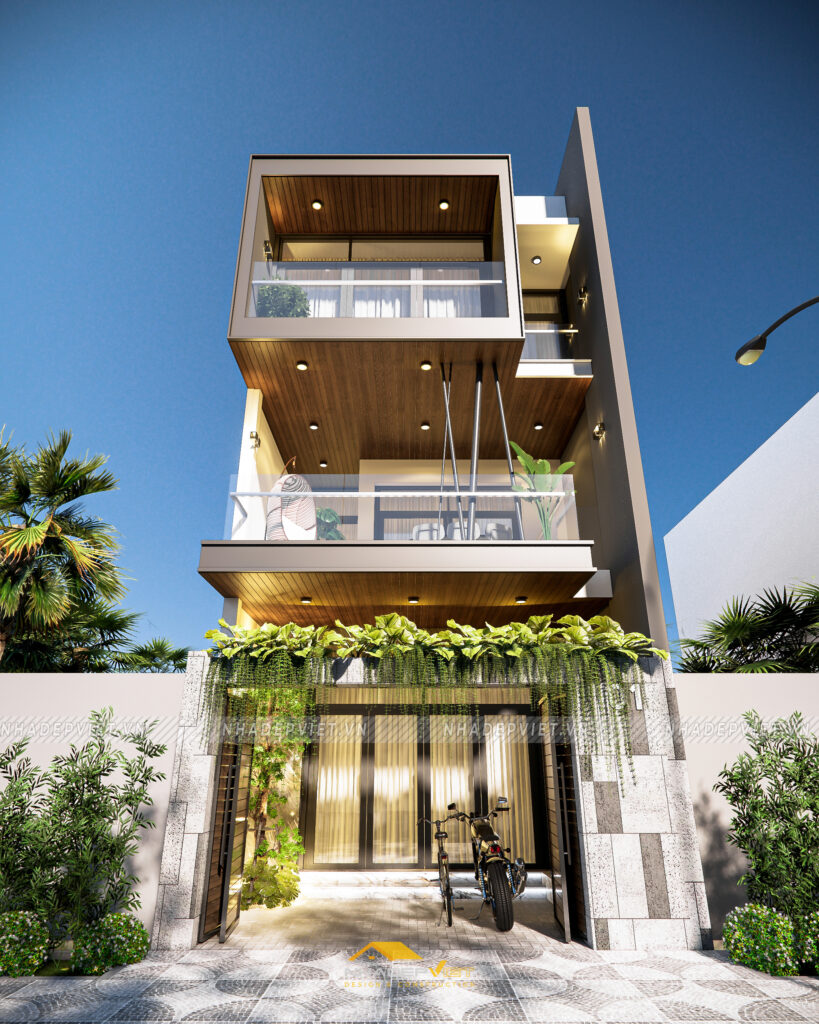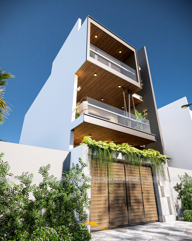 Mẫu nhà phố 6×19 m mang phong cách hiện đại, gây ấn tượng với mặt tiền thiết kế tối giản nhưng đầy tinh tế, hòa hợp giữa gỗ ốp, kính cường lực và màu sơn trắng sáng. Thiết kế hướng đến tối ưu hóa ánh sáng và không gian, với hệ cửa kính rộng và ban công thông thoáng, tạo cảm giác rộng rãi, kết nối trực tiếp với thiên nhiên bên ngoài. Nội thất bên trong được bố trí linh hoạt, tiện nghi cho gia đình, chú trọng công năng sử dụng mà vẫn đảm bảo thẩm mỹ hiện đại. Cảnh quan sân trước tuy đơn giản nhưng được điểm xuyết bởi cây xanh và ánh sáng tự nhiên, góp phần kết nối không gian trong ngoài. Công trình là minh chứng cho lối sống tiện nghi, trẻ trung và đầy cá tính – phù hợp với gia đình hiện đại.