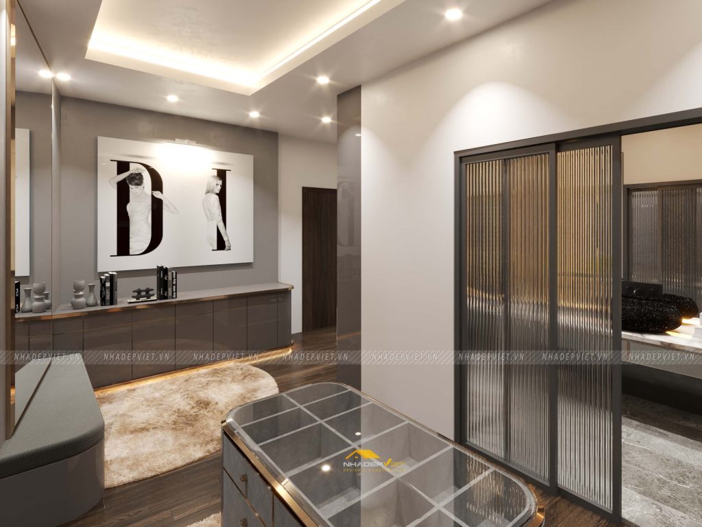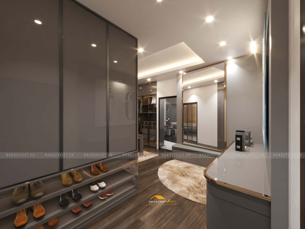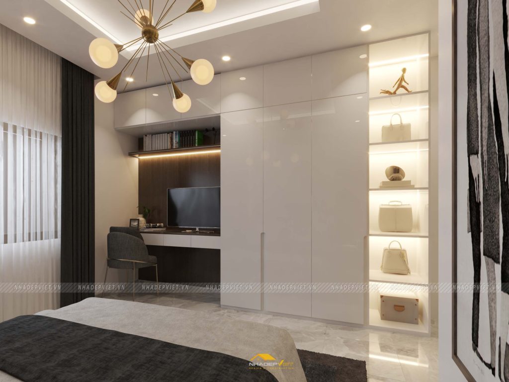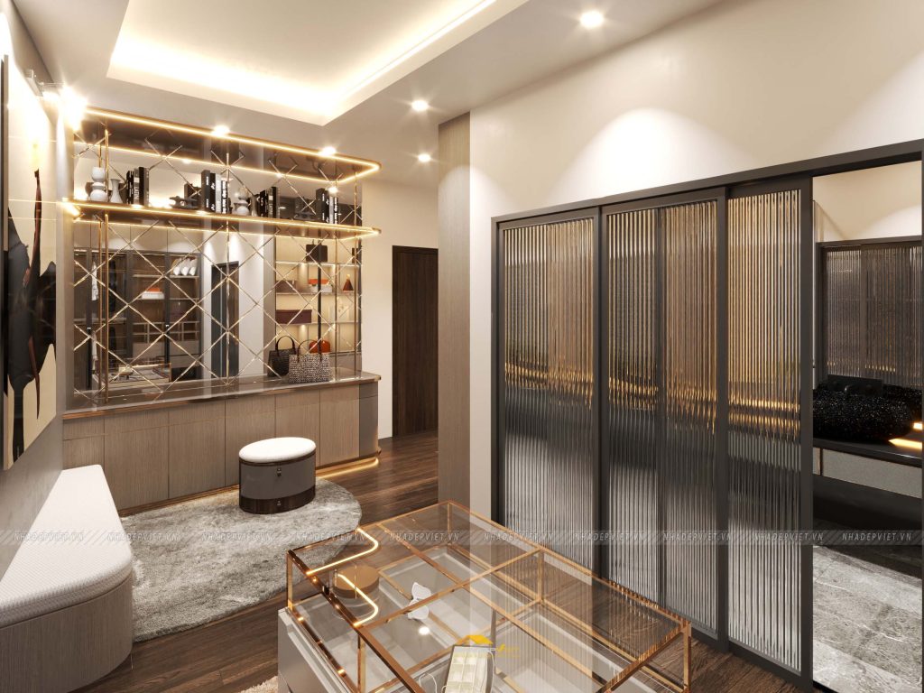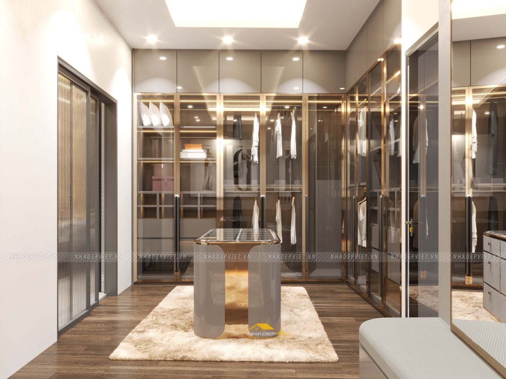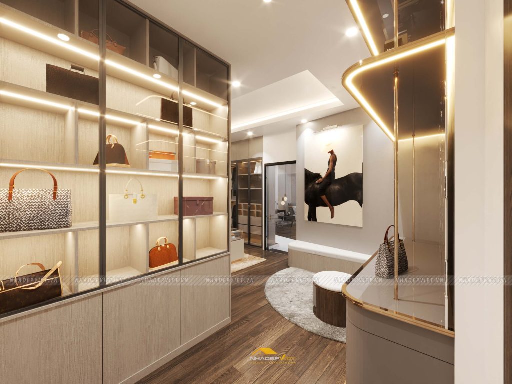 Thiết kế nội thất mang phong cách hiện đại sang trọng, sử dụng tông màu trung tính làm chủ đạo, tạo nên cảm giác ấm cúng và đẳng cấp. Phòng ngủ rộng thoáng với ánh sáng tự nhiên dịu nhẹ, kết hợp cùng đồ nội thất cao cấp và điểm nhấn nghệ thuật tinh tế. Phòng thay đồ được bố trí khoa học với hệ tủ trưng bày sang trọng, ánh sáng LED âm tủ làm nổi bật từng chi tiết, đem lại cảm giác như bước vào một boutique cao cấp tại gia.