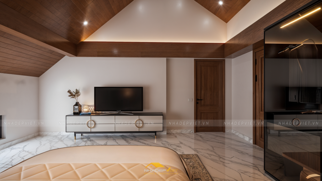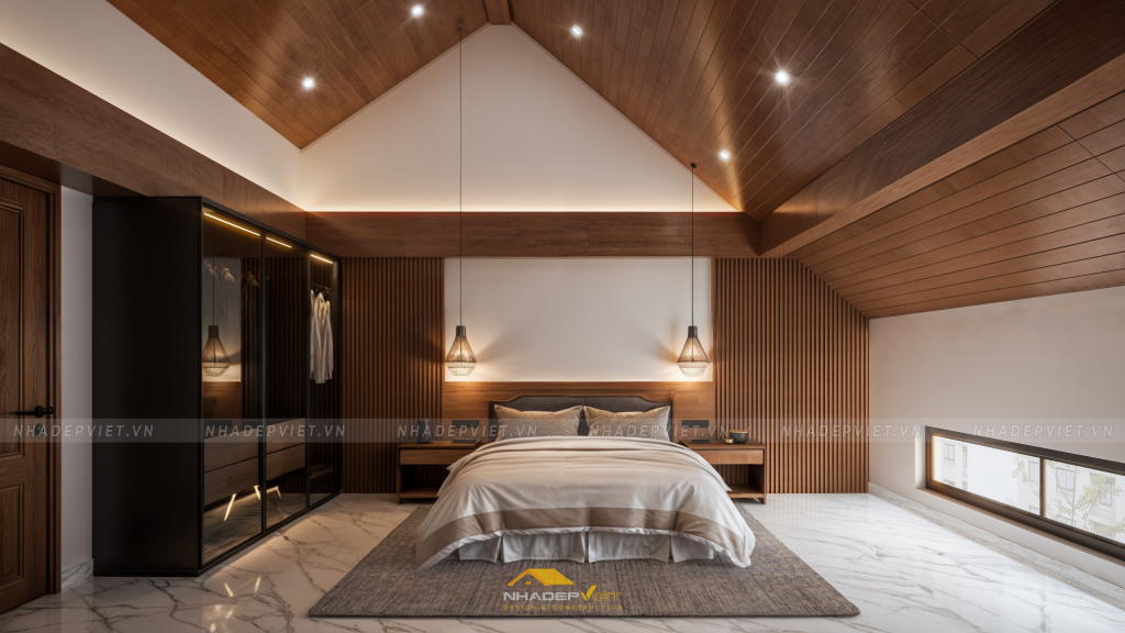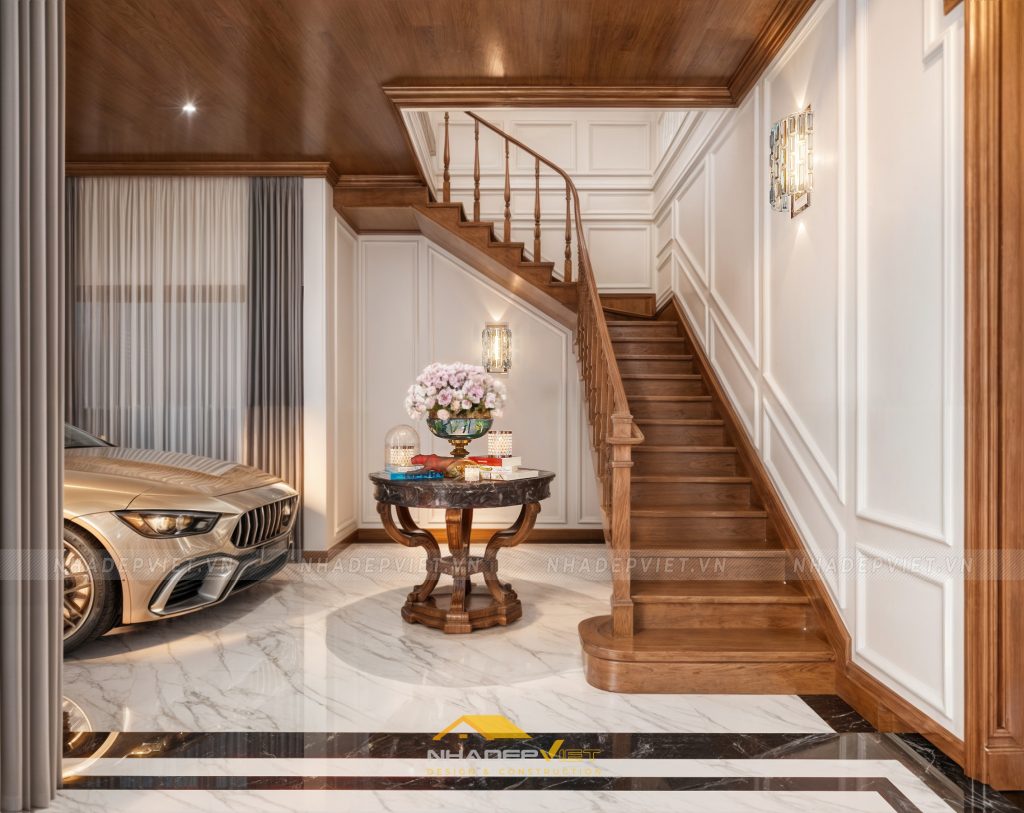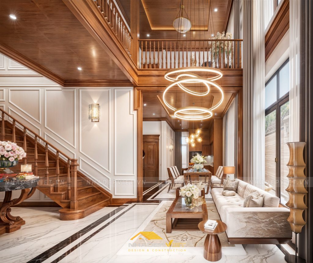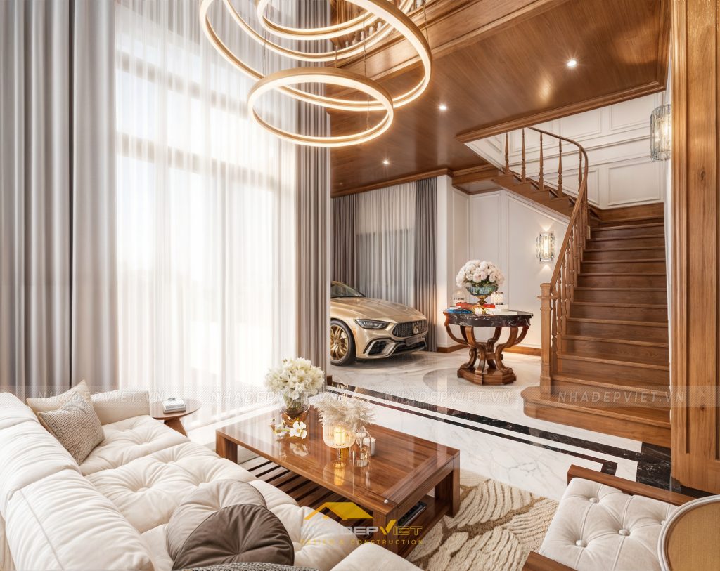 Không gian sống đỉnh cao, nơi vẻ đẹp vượt thời gian của gỗ tự nhiên hòa quyện với thiết kế hiện đại và sự tiện nghi tối đa. Từ sảnh phòng khách rộng lớn với trần nhà cao, đèn chùm ấn tượng và cầu thang gỗ uốn lượn đầy nghệ thuật, đến khu vực đậu xe tích hợp tinh tế, khẳng định phong cách sống thượng lưu. Không gian phòng ngủ được thiết kế ấm cúng, riêng tư với tủ quần áo cánh kính sang trọng và tầm nhìn mở ra bên ngoài. Mỗi chi tiết đều được chăm chút tỉ mỉ, từ chất liệu cao cấp đến cách bố trí khoa học, tạo nên một tổng thể hài hòa, đẳng cấp và đầy cá tính.
